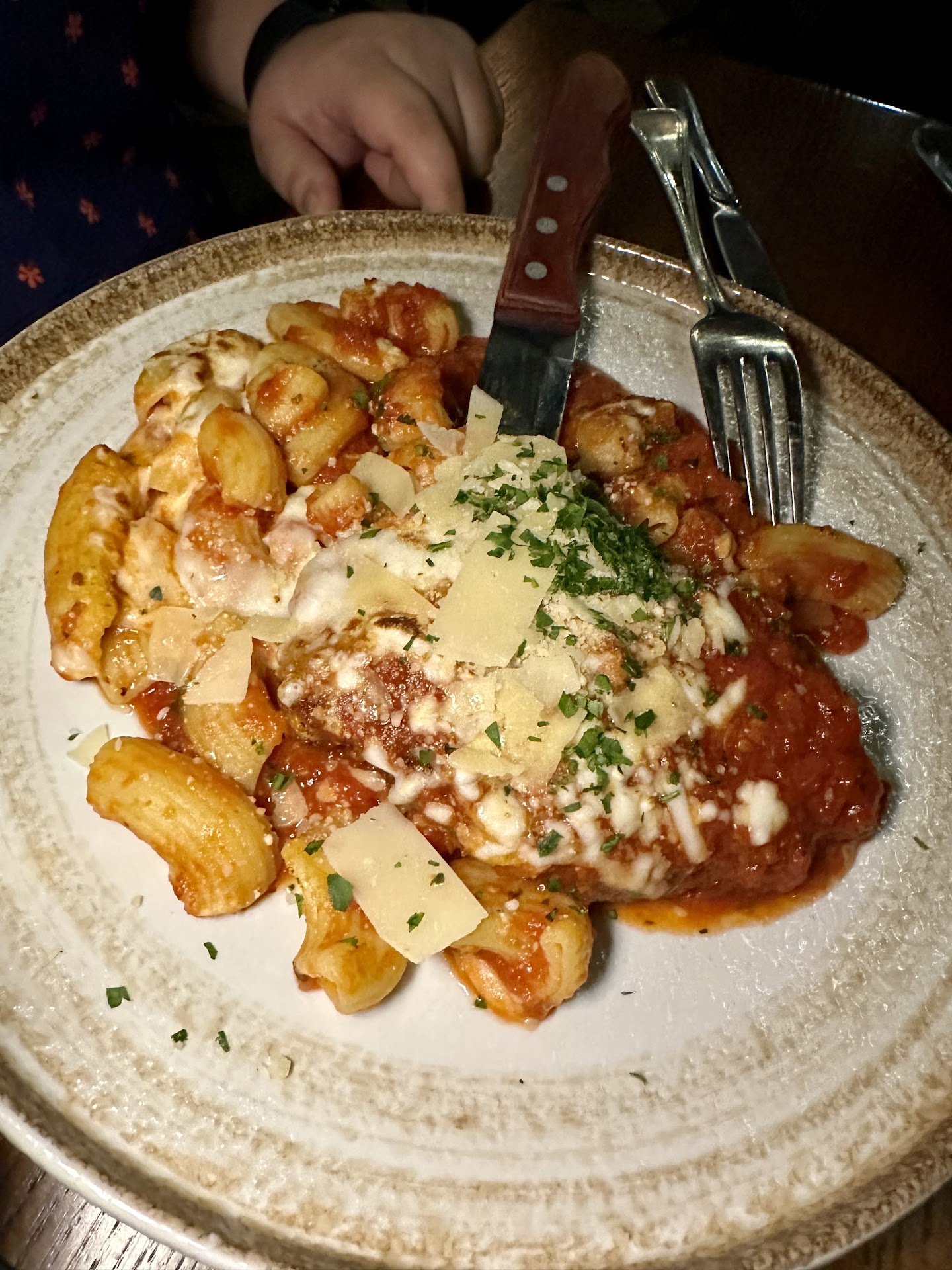 Of the mains, two of us ordered dishes containing braised short rib. They have mastered this: it was intensely butyraceous, had a perfectly seared crust, and had a melty soft interior. Mine was served with cheese-filled tortellini. It was called carbonara, but it seemed to be a more complex cream and cheese sauce. Instead of just one type of cured pork tossed in the sauce, it had four, to include crispy prosciutto, which added textural interest. It was just as good served with the gnocchi and ragu. Do not miss any treatment they may give of the braised short rib. The seafood ravioli were rich and more filling than the pescatarian in our group is used to getting with a fish dish. The chicken parm was the dish we took the most home; it could serve two.