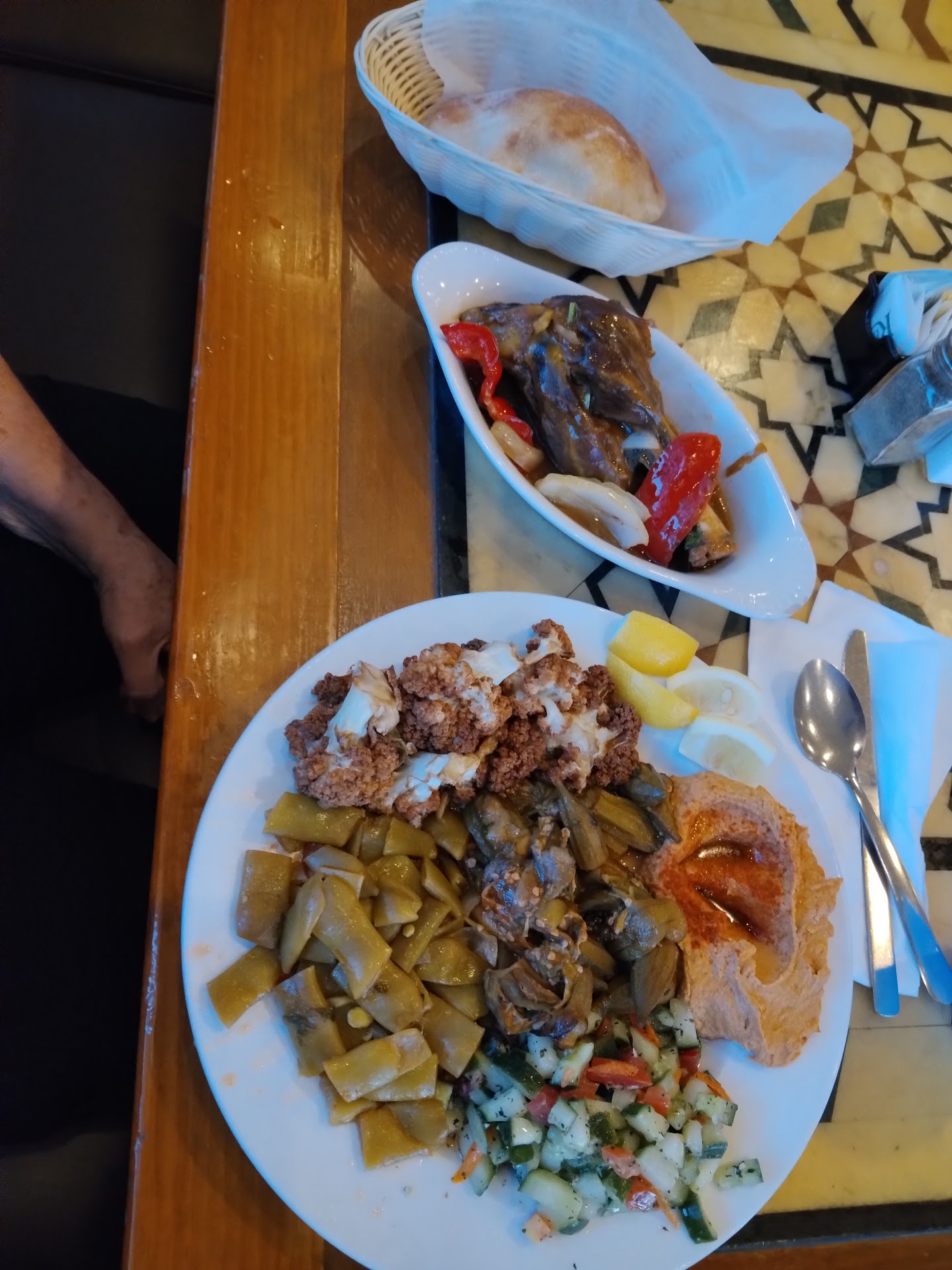 Ā Ā Ā Read moreI came here with co-workers last week and was greeted in a friendly way by a couple of men standing behind a counter of salads. I was surprised because I wasn't expecting 'cafeteria style' and needed a minute to look at the options. They suggested I take a seat right behind me in a booth. I took in all the delicious-looking selections in front of me but wasn't able to make a decision until my co-workers arrived and shared some suggestions. The place was almost empty at 12:30pm - lunch time, which was sort of odd. The soft music playing was very nice, probably better for dinner, but we all liked it. We took up a couple of tables in the back and everyone had something different. They were all happy with their selections. I opted for the lamb, as I was thinking Greek - thought it was going to be similar to Ziziki's and was looking forward to lamb loli-pops. The food here is very good, fresh. I did think the vegetables were cooked in more oil than was necessary but the mushrooms were delicious and so fresh. Staff was friendly, but one man started speaking loudly to another man which caused all staff to look at him, almost scared of him. He was speaking another language and I thought it was unprofessional of him to be speaking so irately to this man in front of customers. Parking is tricky in this shopping center, so be...