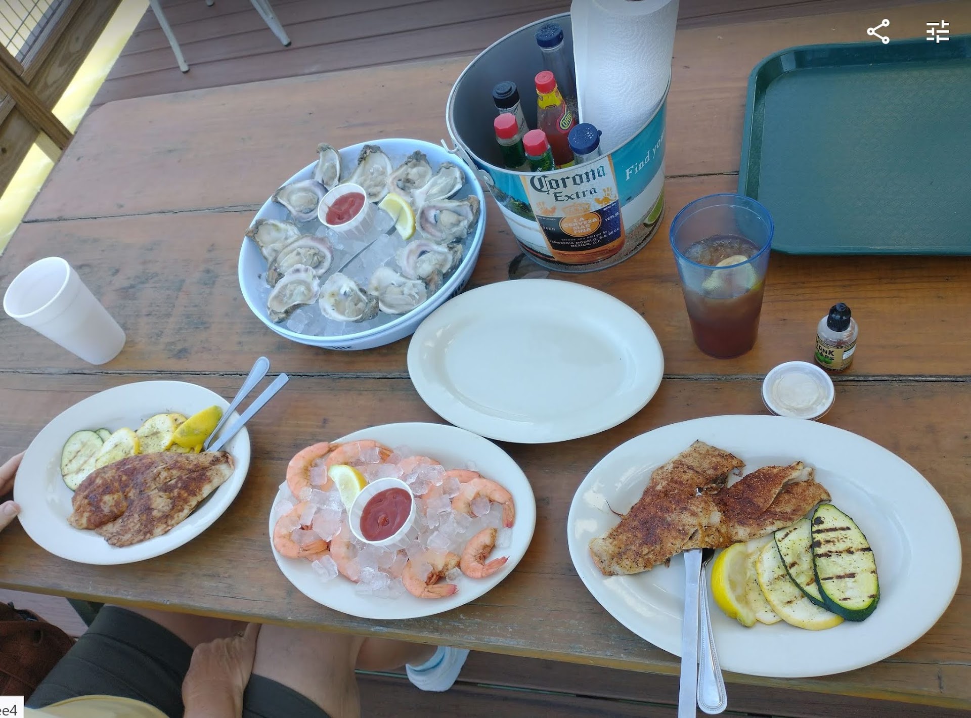 The seafood was fresh, deliciously prepared. My wife had grilled snapper (snappy) and extra grilled veggies (no rice & beans). I had the protein platter with grilled snapper (extra snappy), dozen oysters, and grilled veggies. We also had a dozen boiled shrimp.