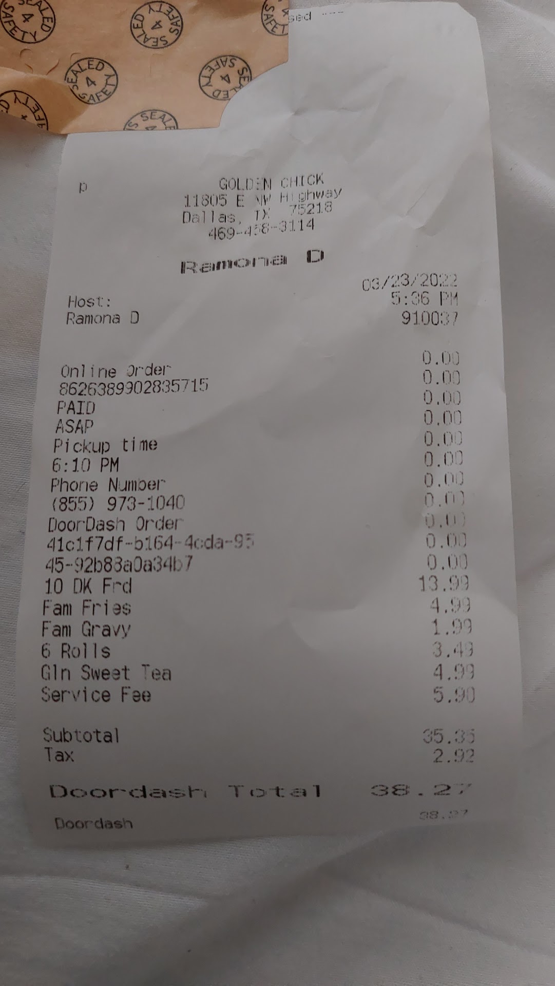 Read moreAbsolutely fantastic experience. The man who took my order was so upbeat and cheerful and used phrases like “awesome possum”. Already off to a great start! When I got to the window, he was wearing a unicorn hoodie and absolutely crushing it on the window, making drinks and prepping orders lightning fast. He has such a wonderful attitude and he 100% made my night. When I ate my food, it was delicious and clearly fresh and I had all the right silverware and plenty of napkins. (Another Golden Chick location that I will not name ALWAYS forgets to give me a fork. Am I supposed to eat these green beans with my hands or just chug them like a smoothie?? -_-) Anyways this Golden Chick absolutely has their game on point and the guy in the unicorn hoodie (I forgot to get his name ☹️) was incredible. It really brightens my day to see people in customer service who are allowed to be themselves and really shine at work like that. That guy is the best and I intend to keep coming to this location even if it’s not the...