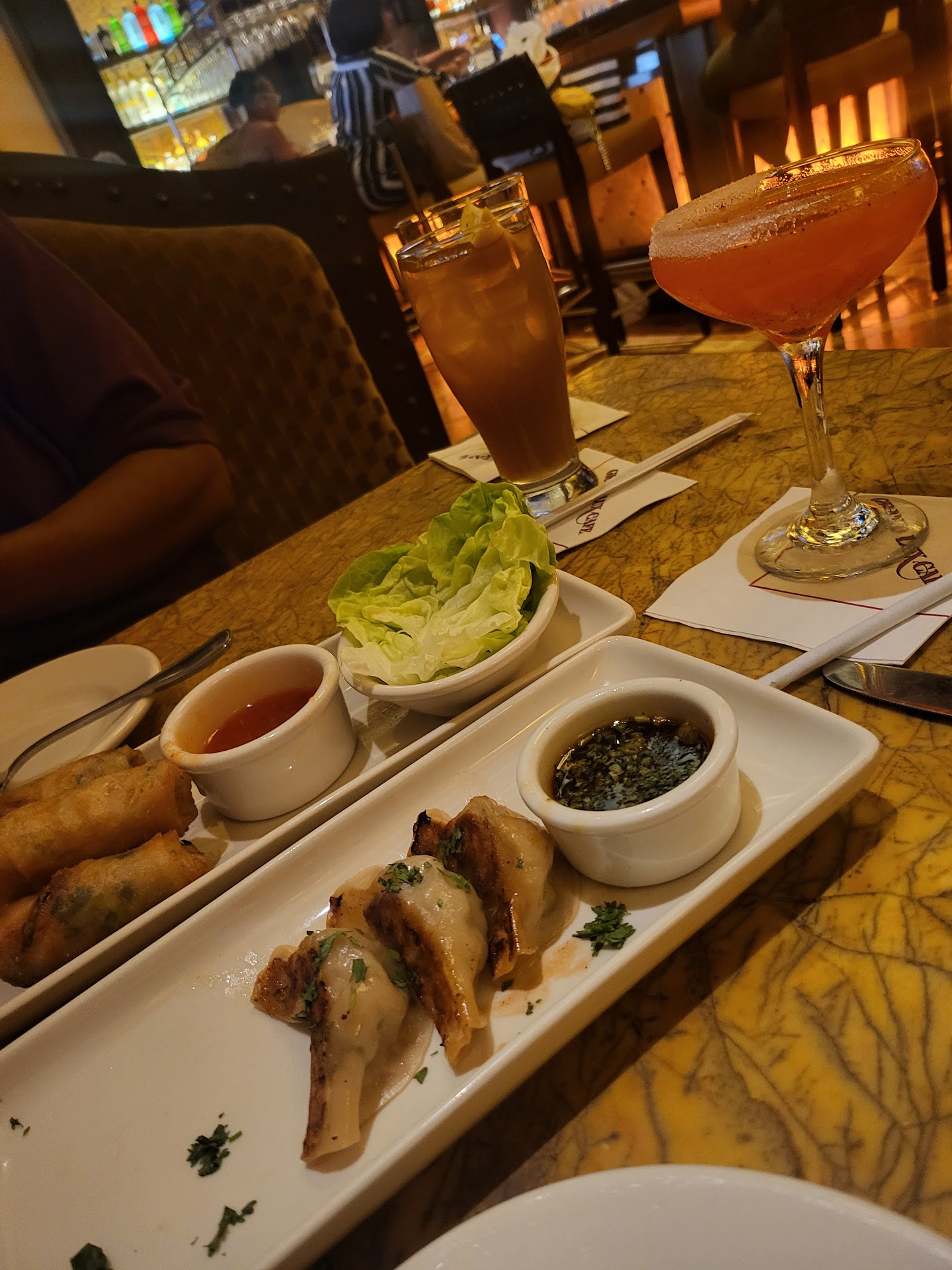 This was our first and our last time here. My boyfriend and I have been in the service industry for fifteen years and honestly are pretty understanding and hate to complain or leave reviews , but our experience tonight was just beyond horrible and I have to let the people know about this! I've never been to a Cheesecake Factory but I would assume this place would be below it. They should spend more money on training their staff than the gotti, over the top, cheap decor. I had called ahead two hours before to make a reservation and when we arrived the hostess told me she didn't have any reservation under my name. After letting her know I called and made a reservation which I said when I first approached the hostess stand then she found it. After one of the hostesses took us into the dining room she stopped us in the middle of the dining room and asked us to wait while she walked away. We were standing there waiting in the middle of the dining room for a few minutes after she finally sat us down at a booth. After finally being sat we waited for 10 minutes to speak with a server and all we were offered were bread and water instead of asking for a cocktail order or if we wanted appetizers. He didn't even greet us with his name. This "server" brought me a martini, an order which I ordered very simply: grey goose martini. He didn't ask about whether I wanted it dirty, olives, or a twist of lemon. When my martini showed up he sat it down and said you wanted it dirty right? I took one sip because sometimes I order it slightly dirty (which is very easy to mess up) and it was way too much olive juice. The next martini came with no olive garnish but again the server after already messing up didn't clarify if I was okay with an olive garnish. Now we order an appetizer. The server came by while I was in the restroom and dropped off the appetizer which was fried but came sitting in a pool of grease from the fryer. We then ordered a salad to split and an entree to split. Both the salad and entree came out at the same time with no extra plates. I had to flag someone down who brought me a hot plate to put my cold salad on. Our server complained about his day and how long he had worked and how tired he was to us when the whole time we were there he didn't spend more than a minute or two at our table. He kept running off to do something else. The Caesar salad came way over dressed and the chicken Parmesan was more breading than chicken. Again, no side plates to split that as it was left getting cold while we ate our salads. We were looking forward to ordering multiple cooked to order desserts after dinner but didn't want to spend anymore time or money here. We clearly stopped eating and were ready to go and I had to flag our server down again just to get the bill. I would never eat here again in my life and honestly didn't want to tip at all but being in the service industry I felt obliged to tip atleast 17 percent especially when he complained to us a second time when he brought the bill for a "sympathy" tip. Not once did we see a manager on the floor or stop by the table. DO...