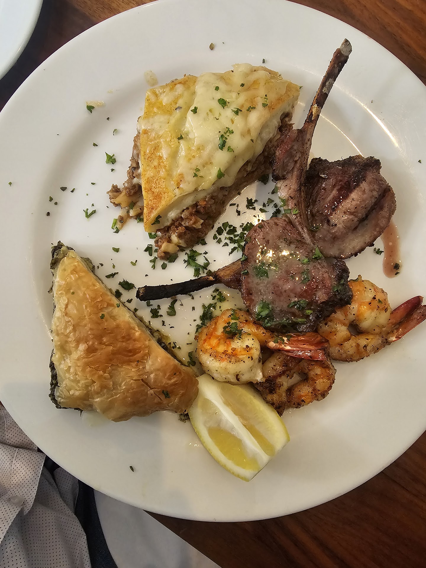 I ordered the Lamb Chops medium rare, with the Greek potatoes. It is puzzling, because the 4 small chops were cooked to a variety of doneness, from well-done to rare - I didn't complain, because all of the meat was well marinated and tender - delicious.