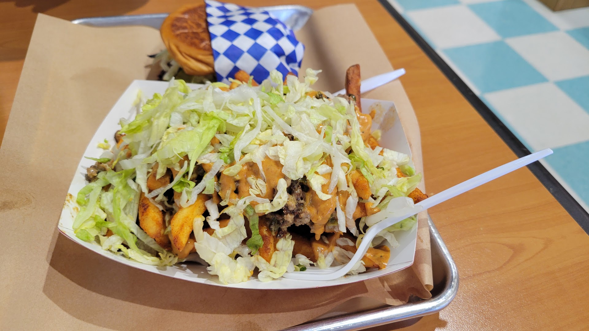 We grabbed drinks from a stand-up cold cabinet and sat down. A few minutes later, our food came out, and you could see the crisp on the tots and fries.