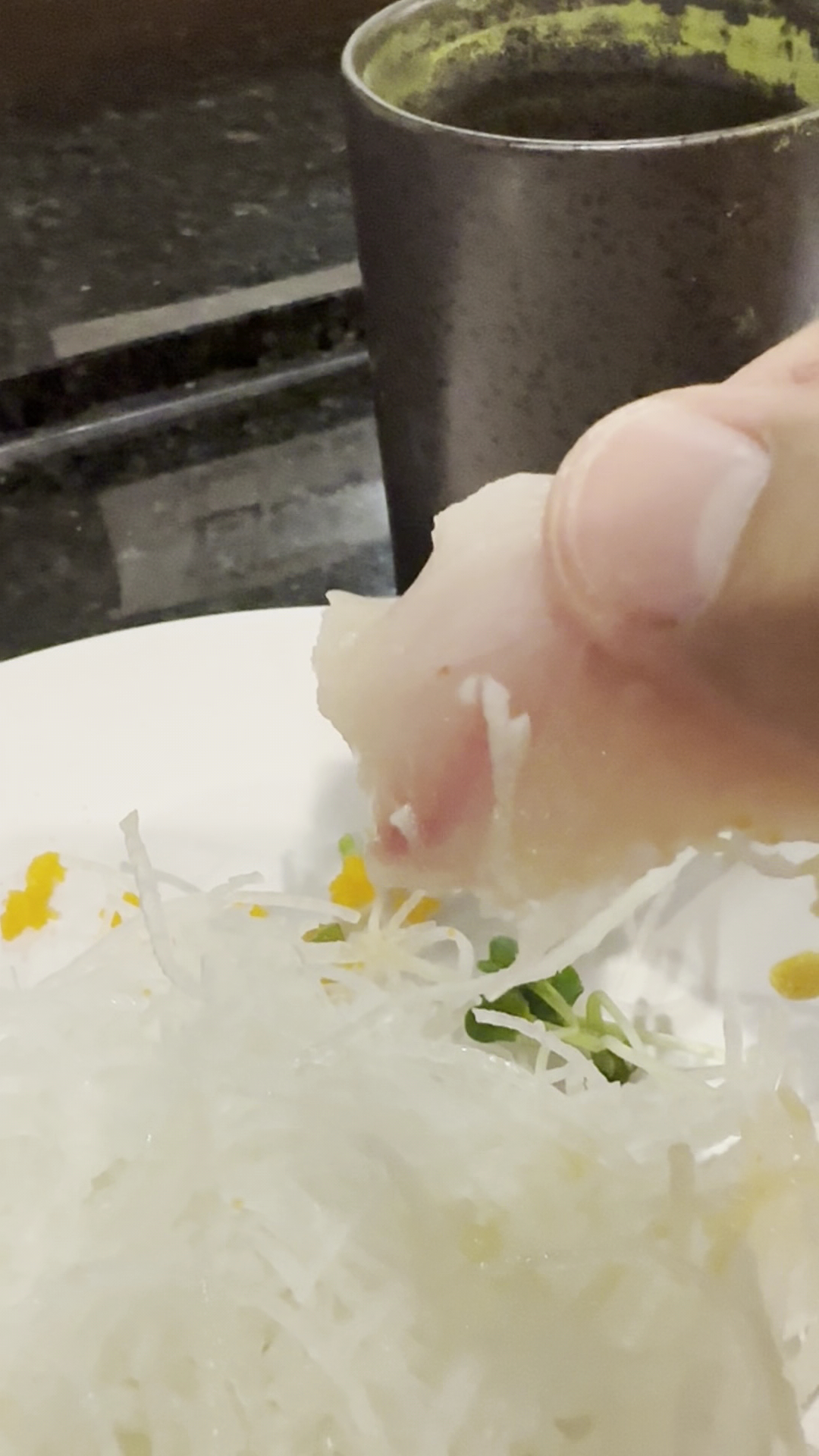 I started with the agedashe tofu and it was perfect. Instead of small cubes and a dipping sauce, like most places, it was square patties with the sauce underneath. Delish. I also ordered the sunomono salad, which is the deluxe version of the cucumber salad. Again, generous portion of seafood on cucumbers. Yum. I finished with the Screaming Orgasm mixed. (Not crazy about the name), but the concept is good. Pieces of sashimi on a bed of shredded daikon with a mayo based sauce. It doesn't look appealing and I thought there was too much sauce for this; it sort of drowned everything, but I'm glad i got it. If I order it again, I would ask for less sauce.