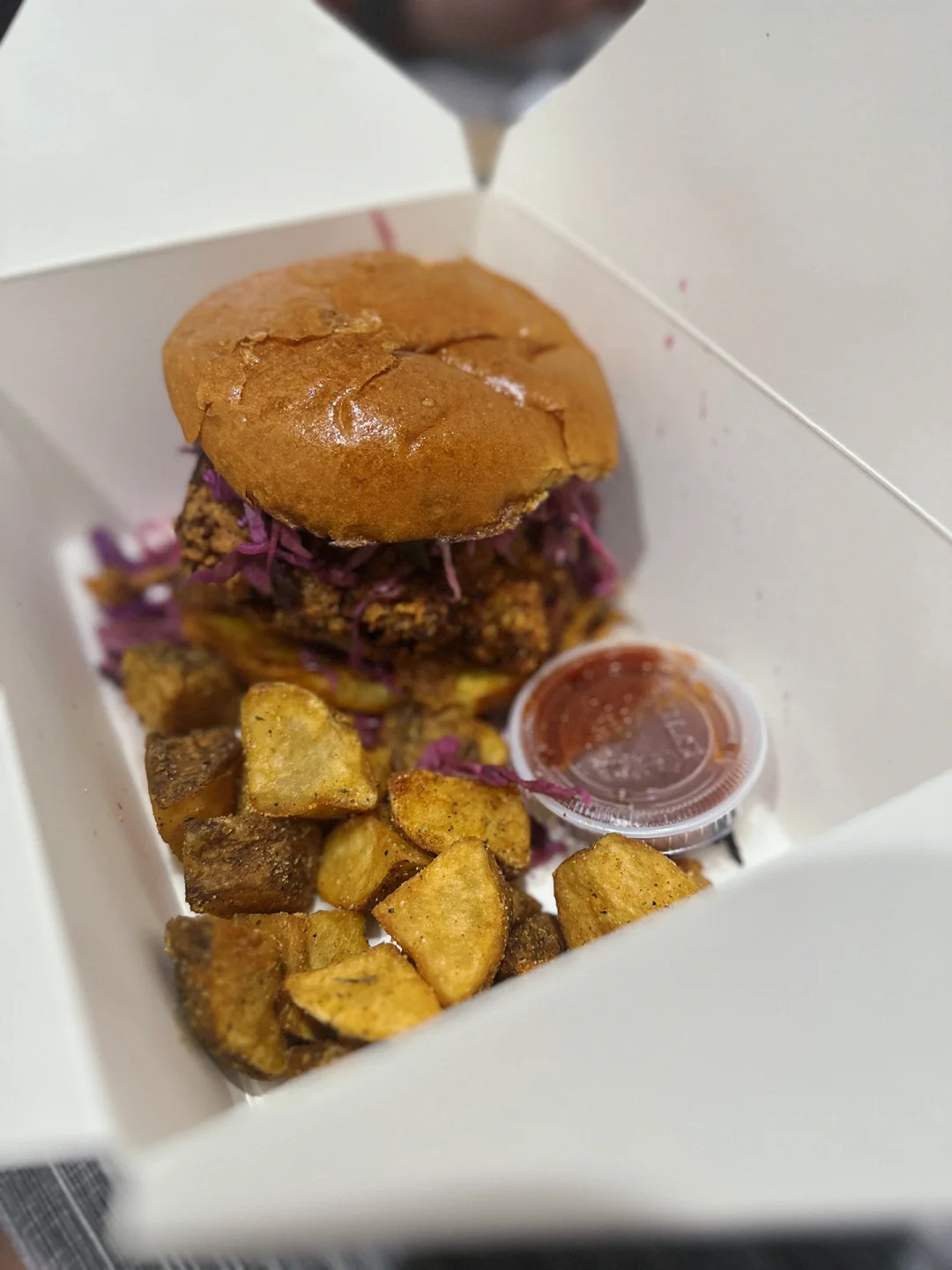 Read moreI hate having to write bad reviews but I can't let this one slide. How this place made it onto whatever list it was of best burgers in Dallas is a mystery to me. First off, it's a chicken sandwich place with only two burgers on the menu. Halal, for what that's worth, and they don't serve beer or any other alcoholic beverages. They have signage claiming their food is fast, healthy and delicious. Well, considering it took almost a full half hour to get my burger- the Notorious- to me, it sure ain't fast. While it tasted alright, it wasn't what I would consider delicious. I reckon since it was a fairly small patty on a fresh bun I guess it was healthy enough. The thing wasn't even dressed. Just ketchup and a mayo sauce on a bun that dominated the patty by 3/4 of an inch all the way around. I should have just passed when the kid behind the counter told me they didn't serve beer when I asked what they had. Note to self. Avoid any place calling itself a burger joint if they don't have any beer to serve. Instead I settled on a 12 oz Dr. Pepper that was barely chilled and only got warmer as I waited outside at a picnic table for the half hour while my burger and roasted potatoes were prepped. Plus, it wasn't very pleasant having to see and hear the owner/manager/whoever he was being a real boor hitting on four attractive young ladies from Indianapolis at the neighboring table, interrogating them on who they were, what they were doing in Dallas, critiquing the basketball program at Indiana U, etc.. The burger hurt my teeth because the char on the outside was thick and just tough instead of crispy. More of a beef puck than a patty would be my best description. There were four or five small tables lined up along the wall inside and about five bar chairs at a "bar" maybe six inches deep with a great view of the back side of the stainless griddle and the tops of the heads of the kids cooking and plating food so dining indoors isn't really an option unless you like being brushed upon by people coming and going. I feel bad having spent 17 of my hard earned dollars there. Maybe their main line, the chicken sandwiches, are better. I don't know and don't intend to try and find out. I'm from Louisiana and I truly am one of those who lives to eat rather than eats to live and while I can overlook quirks in floor plan, architecture, style and the like, I cannot overlook mediocre food quality and mediocre service. Two stars because I'm being charitable. Nope. I take that back. Two stars...