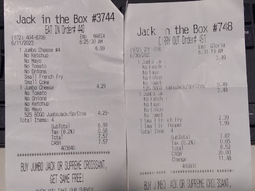Read more06/11/2023 Low rating because cashiers do not ring up food the same way. I've been is several Jack's restaurants. Jack has a BOGO survey coupon on all the receipts for the past few months for a free Jumbo Jack. Problem is, they do not sell a Jumbo Jack combo. They have different varieties with cheese, bacon, double jack, etc. There is one female Hispanic cashier I am guessing starts work about 6:15am- usually about the same time I get there. I order the #4 Jack meal comes with cheese, fries, and drink- then attempt to use the BOGO survey coupon- All other Jack restaurants just add the jumbo jack then take off the price just before totaling. But at this location, this cashier-Never see her name tag- says she can't ring it up this way. Instead she wants to ring up all items individually which makes the cost go up usually about $1 but this morning she rang it up was about $2.50 more. I refused to pay $9.50 for something I normally pay $7.57 for. I told her to cancel the sale, I'm going somewhere else and walked out of the restaurant........................................................AND UPDATE----- Went in this morning 7/28/2023 to get breakfast- prices on menu are not the same price they ring up at register. See photo below.------------------ ANOTHER UPDATE-- 11/6/20223- Went to JIB #748 in Dallas, ordered a Ultimate breakfast sandwich only with small drink. The menu on the wall stated $3.59 for the sandwich but was charged $4.59. The cashier said the register has the latest updated price and the menu has not been changed yet. This is not the first time for this to happen to me at JIB restaurants. Tired of cashiers making mistakes or charging what ever they want to charge. If I order the same items every visit, it should have...