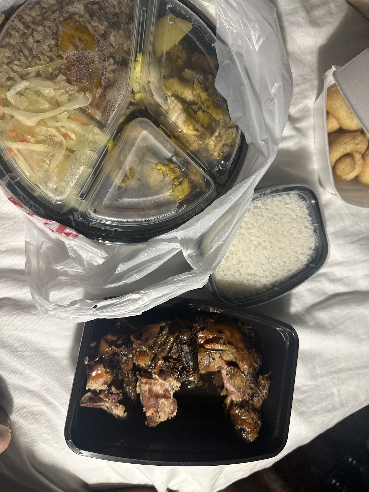 The pictures of this location are not of this building. This building is a smaller shack like building with no room for dining or tables or Dj booth as shown in the picture. I placed a pick up order at this location by mistake trying to reorder from Jamaica Cook Shop. I arrive thinking I was in the wrong location because the picture is totally not the building. I was still excited like okay this is a new place and I’m sure they are good. My son and I went in and waited about 5-10 minutes and ringed the bell but no response. We went back to the car and waited 10 more minutes and then returned to see if anyone was back to the restaurant. Finally a lady came out telling the man that was working on his car by the building that she had to go to catch the train. They continued to speak about the employee having to leave and the man working on the car outside stated said she placed her order with junior. They finally address us and spoke and said they are waiting on junior for my oxtail order. Junior came and apologized and we received our food.
