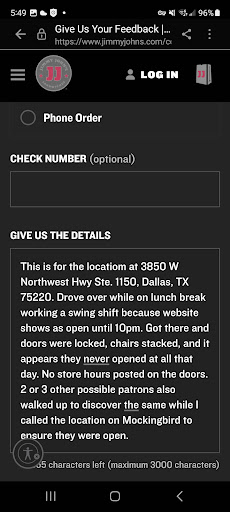 Read morehorrible,i ordered over a hr and a half ago,when I was on the phone ordering not 1 employee could have told me that the address on the website was incorrect!!? very disappointed in the way they handled this situation,my husband drove for a hr straight trying to look for this place,he called the store 4 times,was put on hold multiple times before a smart ass employee told him the address changed and could give us free cookies? wow,what about the time/gas spent,he carelessly then told my husband he should have got delivery,however they dont deliver here either,they keep calling my husband asking if hes coming,get it together jimmy johns and stop ripping people off,work on your customer service and common sense,will not be...