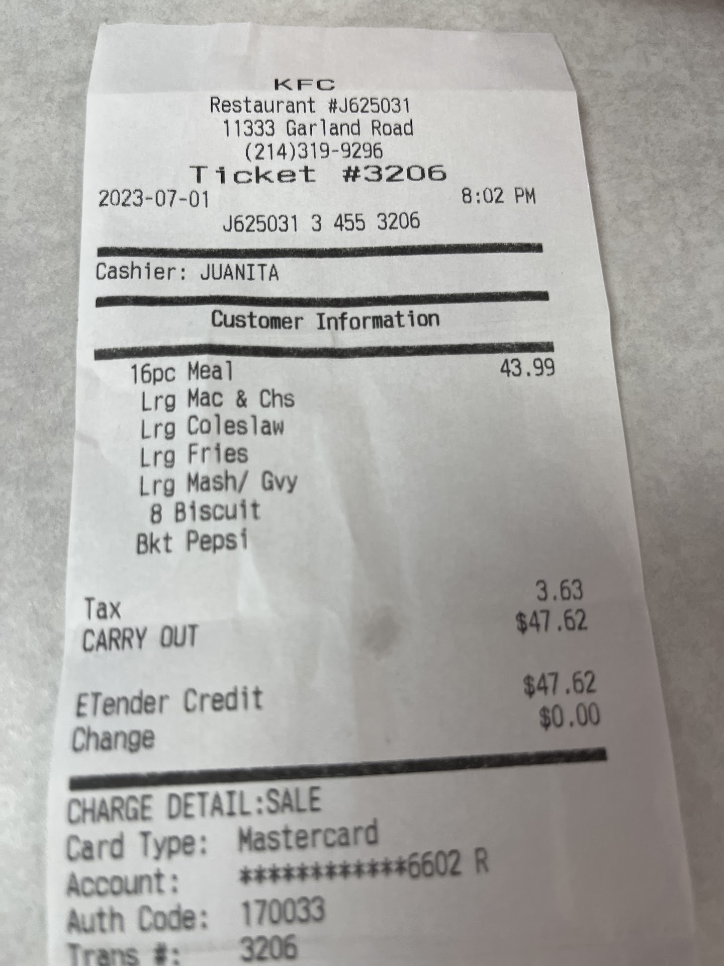 I went to the KFC at 11333 Garland Rd Dallas, TX 75218 at about 6:30pm last night, a Saturday night, to pick up a dinner for 3. Wow what a mistake. I wanted a 8 piece bucket meal with 2 breasts. First they tell me they only have breasts in original not crispy. Ok fine. When I opened the bucket at home there were 2 pieces sitting on a seperator paper above all the others. Well those should be the breasts right? Well it was 1 breast and 1 thigh and no other breast in the bucket. You obviously need some additional training at this store so your staff knows the difference between a breast and a thigh. This was not the first time it's happened here. None of the chicken was particularly hot or crispy.