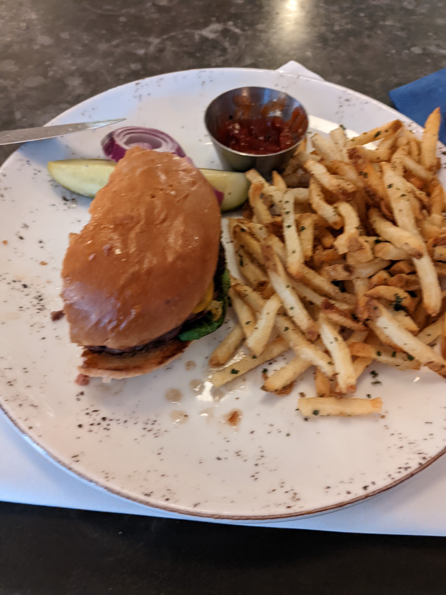 Took half my burger and the weird aftertaste pomme frites and got out of there. Got a better glass of wine and gazpacho at the Spanish Tapas restaurant down the street.