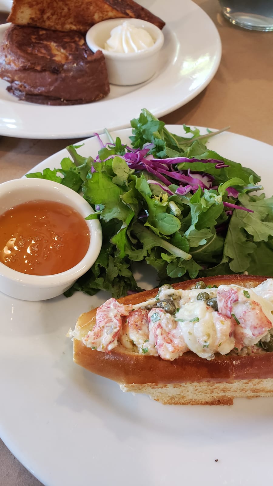 I tried the mimosa and the bellini and enjoyed them both. They were smooth and not overly juiced. The bread they place out as a start is soft, however the butter is rock hard and not spreadable at all. I ordered the Brioche French Toast and my friend ordered the Norwegian eggs. We split the meals in half, so we each got something savory and sweet, or so we thought. The Brioche French Toast is advertised to have some sort of CrĂšme Brulee to it, which is did not have that flavor or crispness. The bread was great, and the fruit was fresh, but overall it was mediocre French toast at best. (I will say the blueberry pancakes looked to-die-for) The Norwegian eggs were not cooked to medium like we requested, they were over easy. The salmon was flavorless, which was a huge disappointment. It needed lots of pepper to help it out. The potatoes served with the eggs were completely undercooked and hard. They brought French fries out in replacement of those and they were great. The fries were crispy and fresh.
