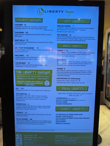 Read moreLiberty Burger is a fast-food restaurant that offers a pleasant atmosphere and delicious food. The restaurant has a comprehensive menu that includes a wide range of burgers, sides, salads, and drinks. Those who wish to save their health and be good to the environment and animals can choose a vegan Impossible burger, albeit at a steep charge of extra $4. Those who just want to cut on carbs can have the burger served in a lettuce warp.