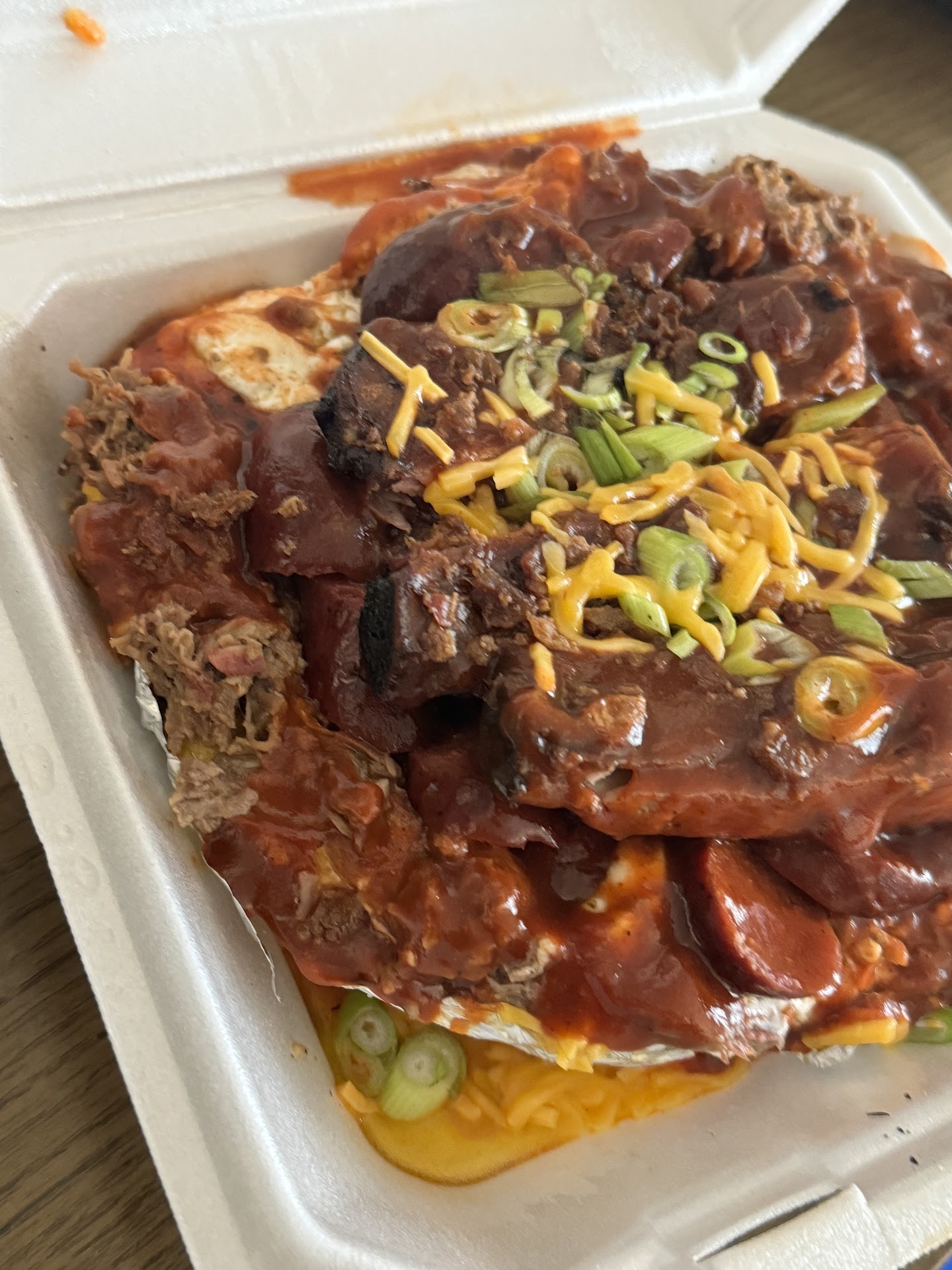 Read moreI placed the order on Uber Eats. I ordered the 2 meat plate short ribs and slice beef. With the extra meat, which was a hot link, my sides collard greens and baked beans and I selected sauce on the side payed extra to order pickles and peppers That being said i received Green Beans. Bake beans with chopped beef on top, slice, beef and ribs swimming in sauce. Probably 2 full cups of sauce. It's just swimming, no pickles, no peppers, very dissatisfied. And there's a difference in ribs and short ribs My husband ordered the 3 meat potato. He was satisfied...