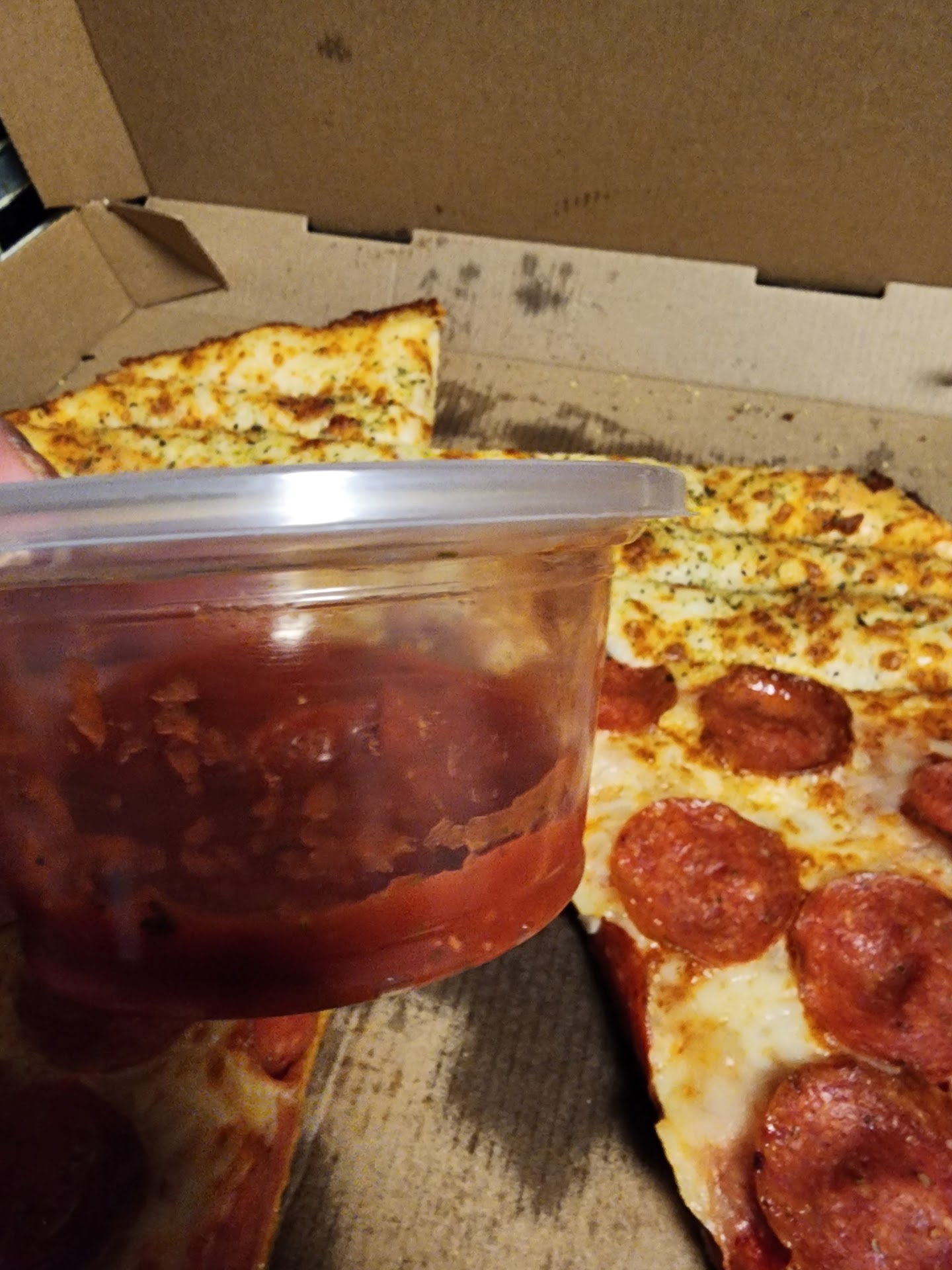 It's been a good couple years since I've eaten LilC's due to a bad pizza experience. Stuck with Domino's for a while. But I've been seeing reviews on YT on how LilC's has gotten better?? So I decided to check the menu and I ordered the half pepperoni half Italian cheese bread. And ordered extra crazy sauce.