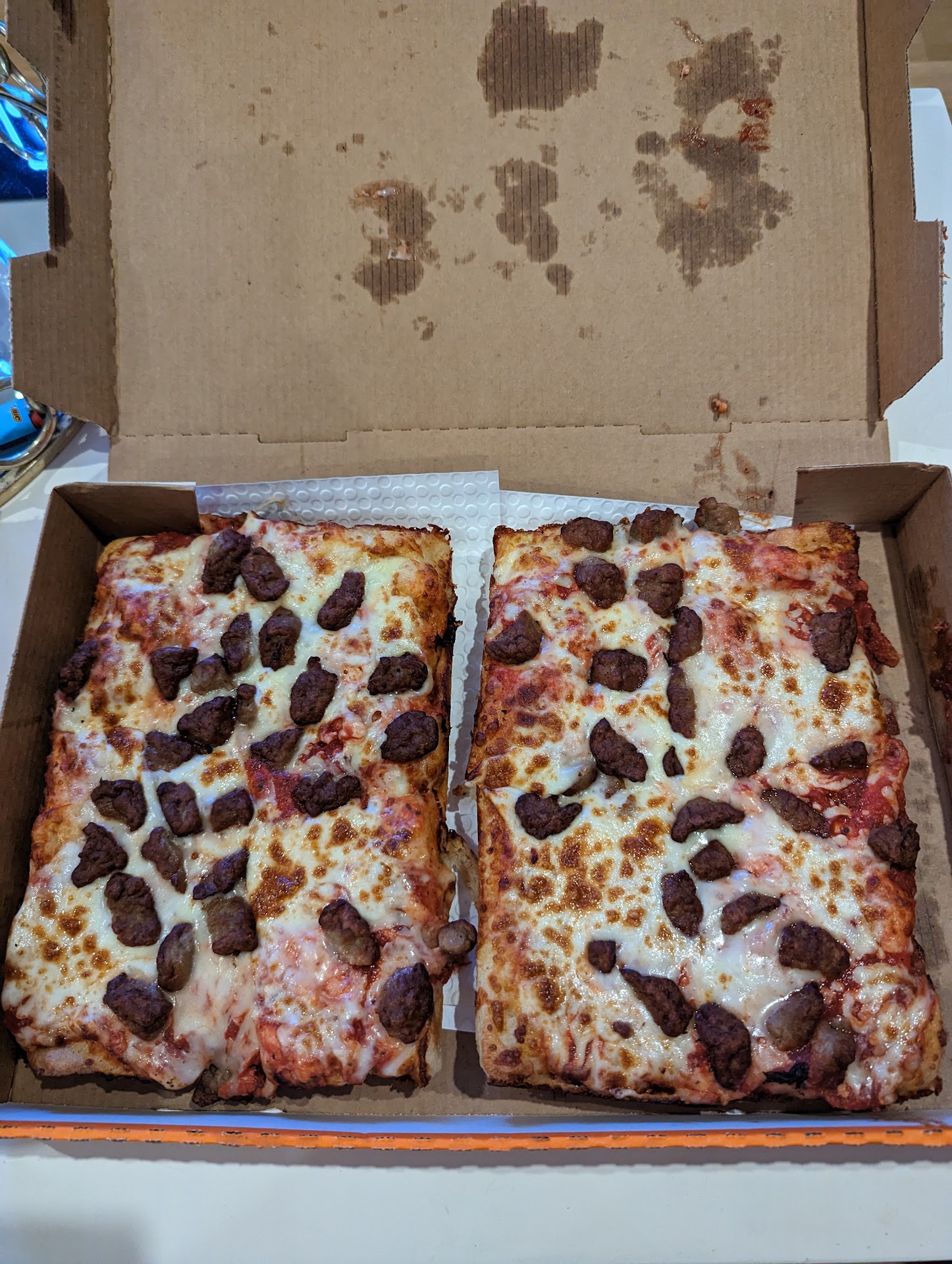 After many minutes of waiting I received my pizzas and cheesy bread and needless to say after driving 25 min I got home and the pizza did not have tomato sauce and if it did it was very faint to the eye.