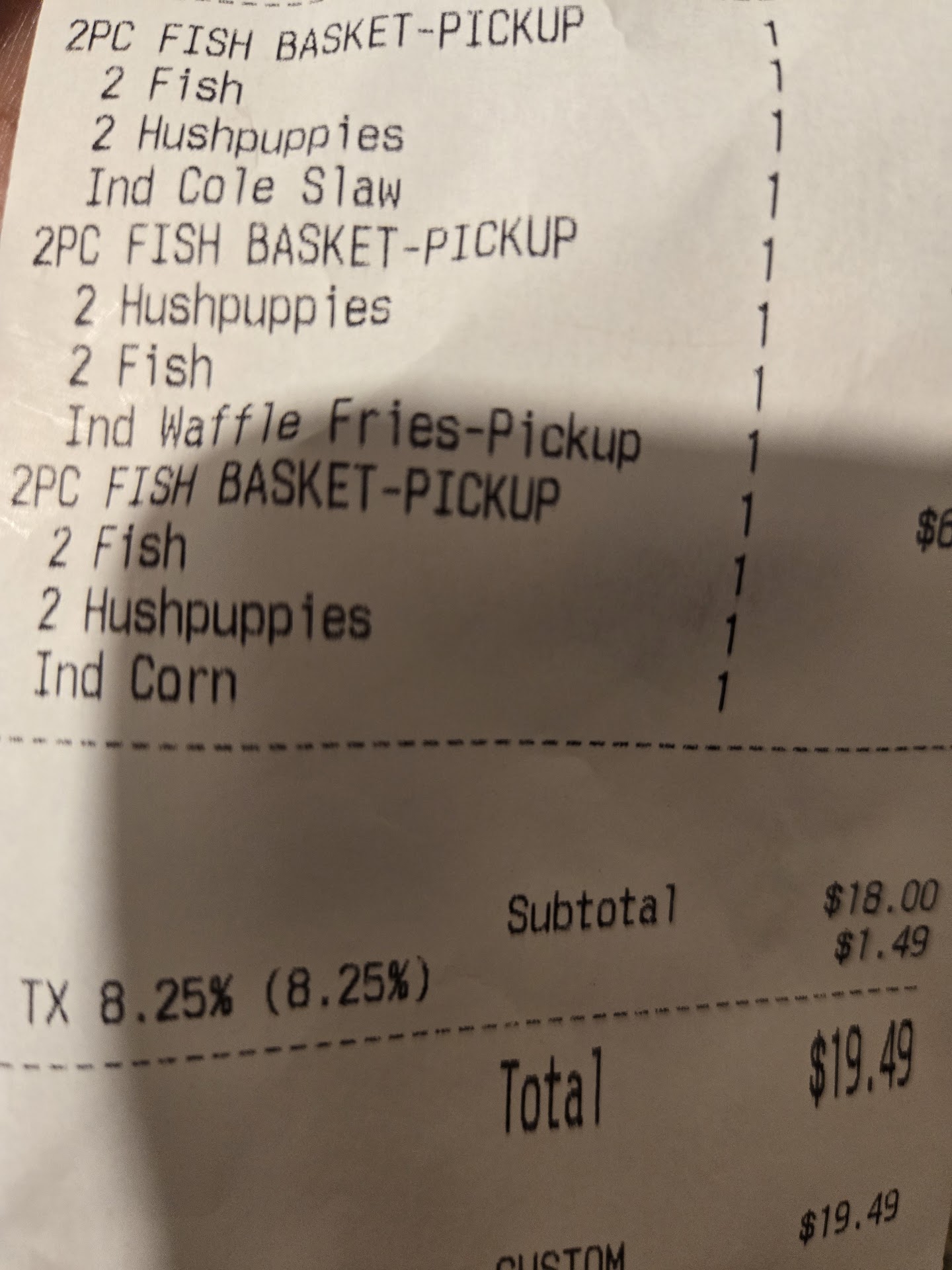 ย ย ย Read moreThis place is going or should I saw gone down. I wanted to try the new lobster bites but there was no price, and the cashier couldn't tell me what the price was without ringing it up. "I'd ring it up but I would have to void it and it would mess up my register". Like I gave a dam๐needless to say I had to get the platter which included 2 pcs of fish and the lobster tails. We already had the family pack. We asked for tarter sauce and was told they didn't have any. I was embarrassed for the cashier she seemed untrained. Couldn't answer questions regarding the menu. When you hire these kids train them to say yes, no and not uhhh, huh, and stop scratching at the window! ๐คฃ Got home and it's not what I remembered. I've NEVER had bad fish here! It was mildly warm, tough, hard and not the pretty golden fresh fish I would normally get. You guys are going down! Won't be back to...