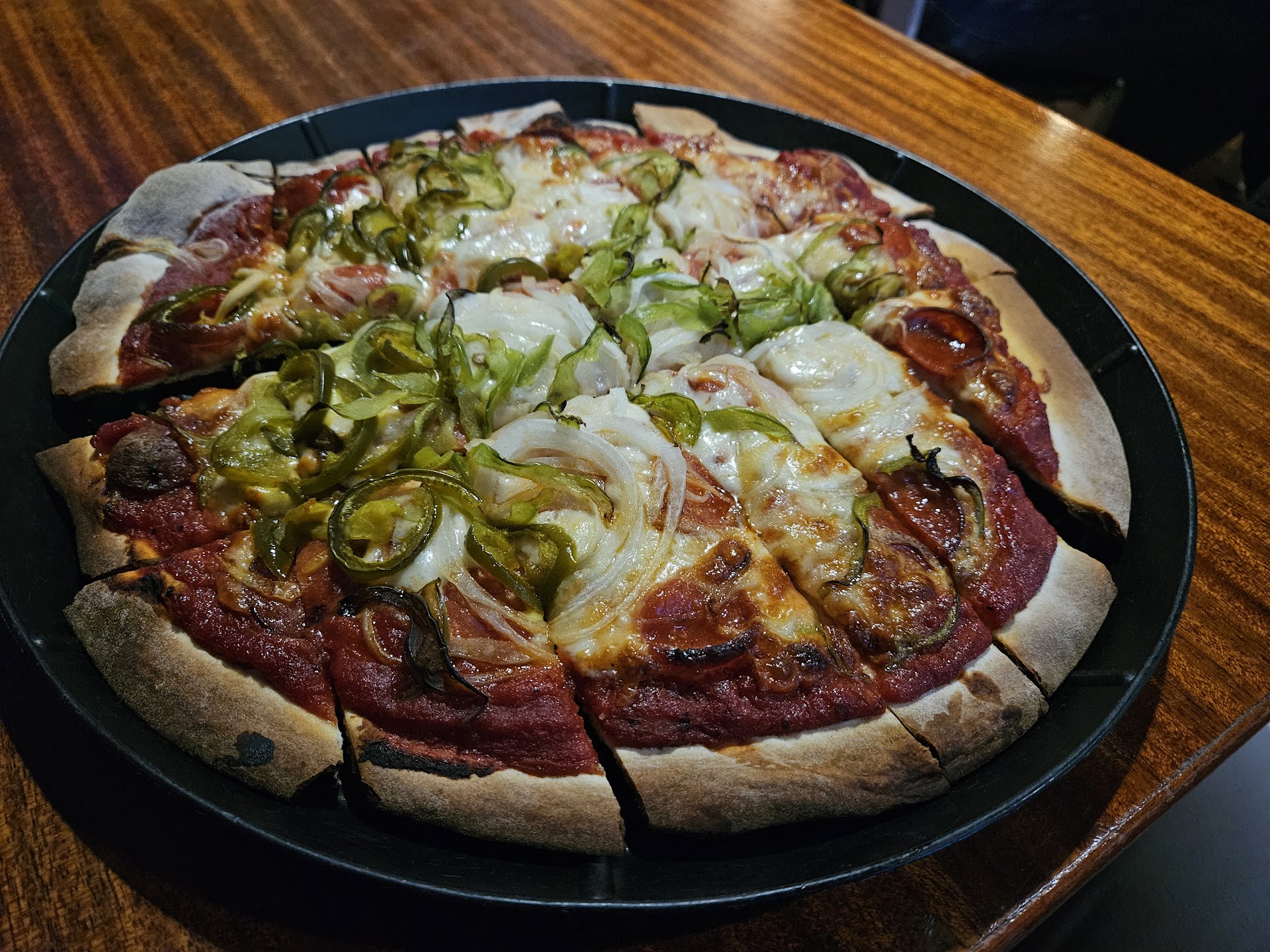 As for the pizza itself, it was a cracker-thin crust cut into rectangles - popular of the Midwestern style. The cheese mixture consisted significantly of cheddar, the sharp flavor of which I thought overpowered the sauce and even the toppings to some extent.