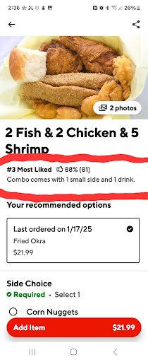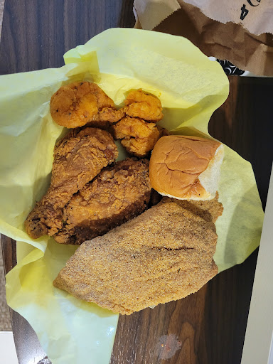 Read moreToo start I got the chicken shrimp and fish combo. Comes with 1 side and a drink. Background I had to doordash this order as I'm here on business and came out with another coworker who was using the car. So to start I kinda knew it was going to be bad as the description says 1 side and 1 drink. Yet there isn't a drink choice, so I knew automatically I wasn't getting that. I also didn't really want the drink as I had my waters and beer in the telly. Now the food got delivered and the brown paper bag was stapled shut so I grab it opened it up and there's another brown bag. I open that and found the delicious smelling greasy, fried. Crispy food. Just what I needed, but my side piece was missing and no where to be found. Yes of course my drink was missing too but we knew that was going to happen. Yet I was looking forward to some red beans and rice. So what can I do but eat what I got. The fish batter and seasoning were decent. The chicken had me a bit worried as it was a lil on the dark side, the darker the berry the sweeter the juice doesn't hit home on fried chicken, but this chicken had this hint of spiciness that I loved. The shrimp, well ok I'm be honest, TRASH. Let's not talk about that. So I'm gonna rate this restaurant as BASIC. My guess it's one of those places where you gotta catch it on a good day. Oh and one more thing that jalapeno was not pickled, more like fresh jalepeno with a...