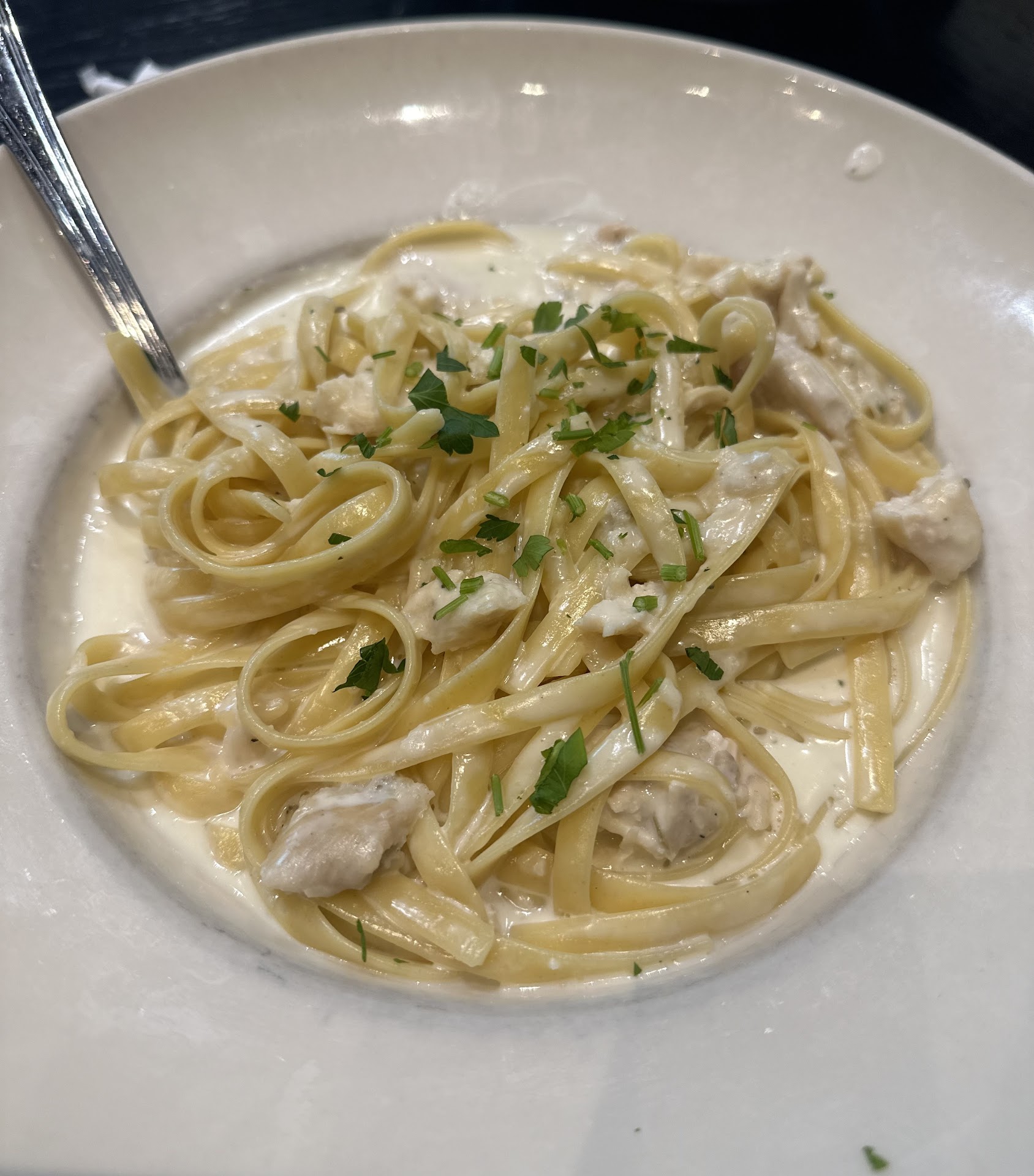 We ordered right away, as I said we were hungry. Thereâs not to many choices on the menu (maybe be issue itâs the airport)? So opted for pasted. We got spaghetti and meatballs and fettuccine Alfredo pasta with chicken. The food came right away. The servings were huge as we were told so we shared the Alfredo. It was more than enough.