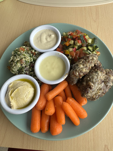 I had the honey chicken kebab with an Israeli salad and air fried fries. My wife had the meat kebab with Brussel slaw and fries.