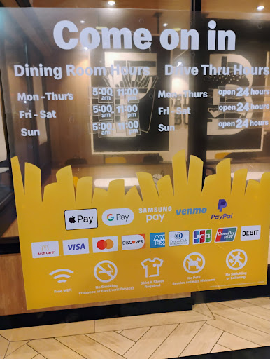 Read moreAs this photo indicates, the posted dining room operation hours are 5:00 a.m. - 11:00 a.m. This photo was taken at 10:15 p.m. last evening, and the doors are already locked. I look inside the restaurant and see several workers sitting down trying very hard not to notice me. After tapping the door, one guy motions for me to go through the drive thru. The problem with that is I don't have a car, and I walked about a mile to come to this restaurant after I recognized a few days ago that they've extended their dine-in hours to 11:00 p.m., so I walk to McDonalds fully expecting to get a meal, and was angry when I realized they had no intentions on honoring the new time posted on the door. It's bad enough that McDonalds hates poor people and for most of the day only sale their food to people wealthy enough to afford a car, but it's an even bigger travesty when they claim to be open for business a certain set of hours and are not.