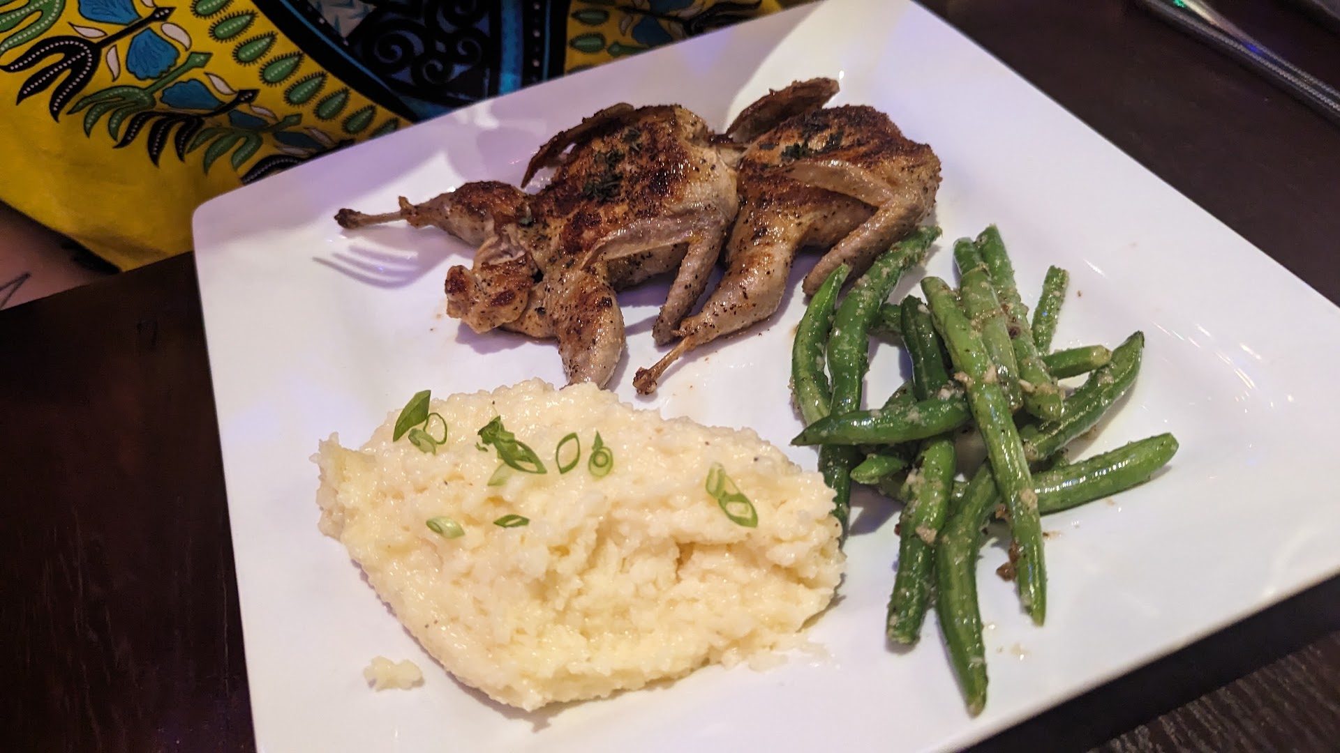The deviled eggs pleased the wife, who loves them. And her quail were juicy, very difficult to do when such a small bird is grilled. The green beans, gouda grits and mashed potatoes with proper dark gravy all excelled.