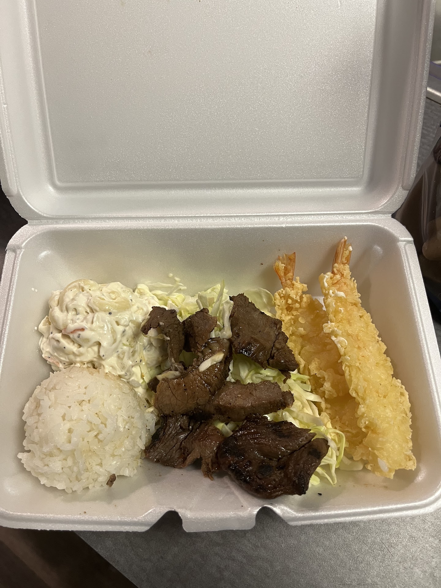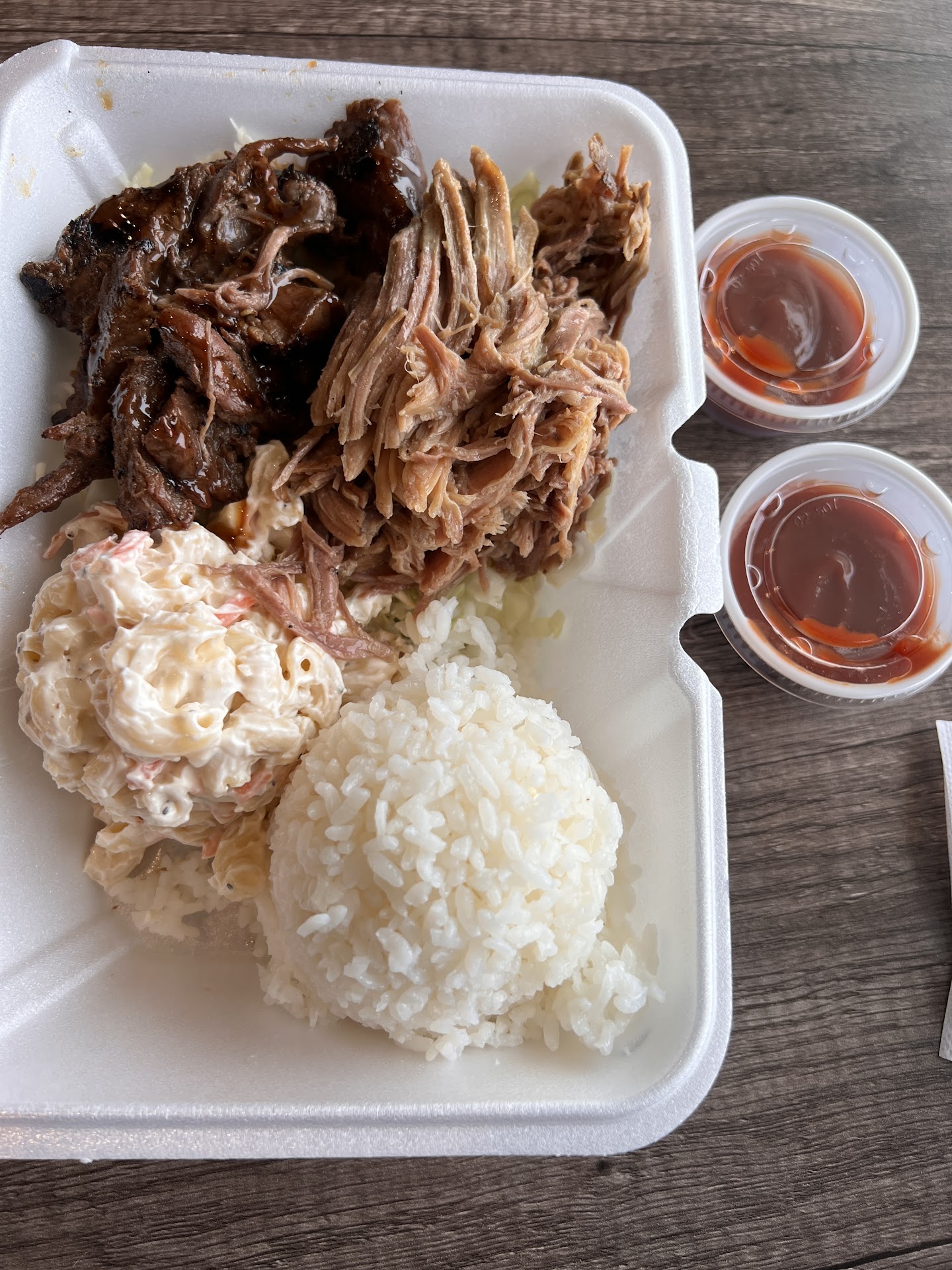 Mr. got the Ekolu with Tempura Shrimp, Teriyaki and Pulehu Chicken. The tempura shrimp was fresh and crispy as it should be and looked exactly like the picture(a plus). Mom's and I both got the Mini Plate. Her's with Teriyaki Steak and Chicken which were both lacquered with the tangy, salty teriyaki sauce that I remembered enjoying on the island. They were both tender and flavorful. My Mini Plate had the Kalua Pig(think of it as a hawaiian pulled pork) that was tender and well seasoned, but a little less juicy than I would expect. The Pulehu Chicken was simply seasoned with garlic, black pepper, and a few other spices that were well match to the tasty chargrilled chicken thigh. However, it lacked the juiciness that I would have liked, if not being accompanied by a sauce. The rice was cooked PERFECTLY and took me back to the island. The macaroni salad was what I was really looking forward to. The macaroni I remember in Oahu had a distinct tangy and slight sweetness(compliments of sugar and apple cider vinegar) that this one was lacking.