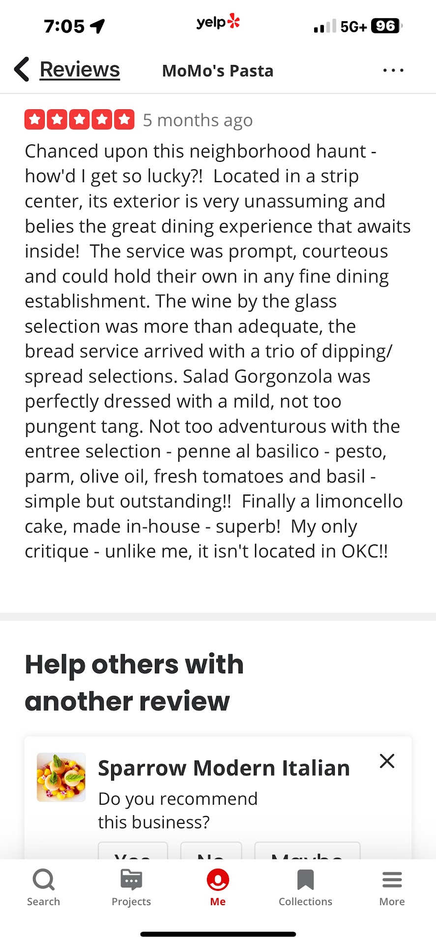 Momo’s Pasta is the opposite of any negative review. It was outstanding in every respect! First of all, everyone who is avoiding carbs, Momo’s pasta has a lot more to offer than pasta! I had the veal chop, which was beautifully cooked and absolutely delicious! They serve several veal scallopini dishes, chicken dishes, and there are a number of seafood dishes as well.