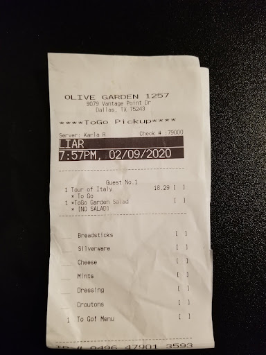 We had to ask for salad and breadsticks (never had to ask before, they always bring bread right away, and they always ask if we want salad). The waiter did not listen to anything I said when ordering. I requested the dressing to be on the side, and I asked for ranch, instead their house Italian. He brought the salad with their house dressing, ON the salad. More time wasted, with the short time we had... I didn't want to make anyone have to stay late, so we were trying to be quick about it.