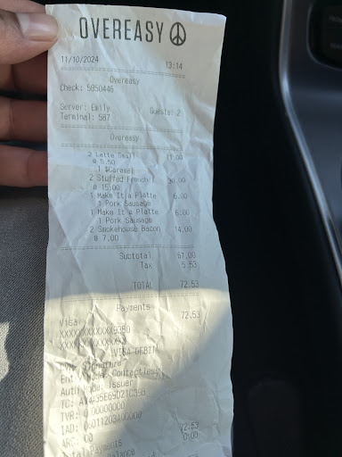 I was in Dallas for some work, as well as a wedding. I was staying down the street and wanted to grab breakfast with a former client and friend. I picked Overeasy based on a recommendation from my hotel concierge. We arrived at Overeasy around noon on Sunday, we went it the door and waited for five minutes in what we thought was the wait area, despite multiple staff seeing us, we had to follow signs to realize we needed to check in at the front. We made our way to the front and again waited without acknowledgement. I waited in line behind what I thought was another customer who was talking on his personal cell phone. Suddenly he turns around and is the host, he asks for name and number, I provide a name and point to the two of us, âTwo Pleaseâ. He said you got it, about a thirty-minute wait. This was fine, there were two other groups waiting so we sat at the behind them at tables near the coffee bar and waited. The other two groups were quickly seated, we got coffees at the coffee bar while waiting. We were generally ignored as the staff gathered to loudly talk in language that is not quite appropriate for a restaurant setting. We continued to wait, a number of new guests walked in and were immediately seated.