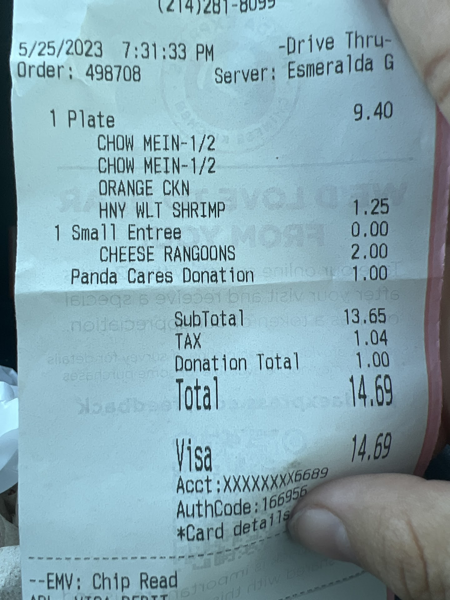 Read moreOrder two plates with double orange chicken. The chicken was dark, tough and looked burned. I took the orders back to the restaurant and ask for another order because of the issues. I was told all the orange chicken looked like that, but that it was fine. She said her manager thought the same things but tasted it and said it was fine. I am a long time customer of Panda Express and I have never seen the chicken this dark. So I requested a refund, the cashier said ‘they’ don’t give refunds. I asked her how are you going to tell me I can’t get my money back, she said that is what she was told no refund because the drawer would be short. I told her I paid with my card. Then she said she wouldn’t know how to refund a card. I asked was that a Panda Express policy and she said their location’s policy, but she doesn’t know about other locations. I then asked for a manager, she told me she was not a manager but she was in charge. Savanna was very nice but I was very disappointed in the food and how the situation...