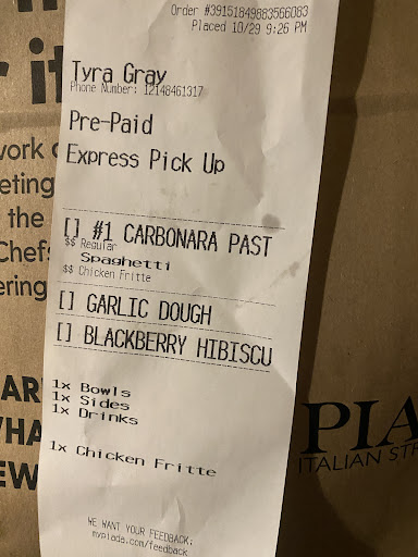 June 2023: We LOVE Piada, but this particular location misses the mark on service every time we go. I am not sure if it has to do with the fact that this one has a drive-thru - It could create an extra layer of stress on the staff when managing in person/mobile orders.