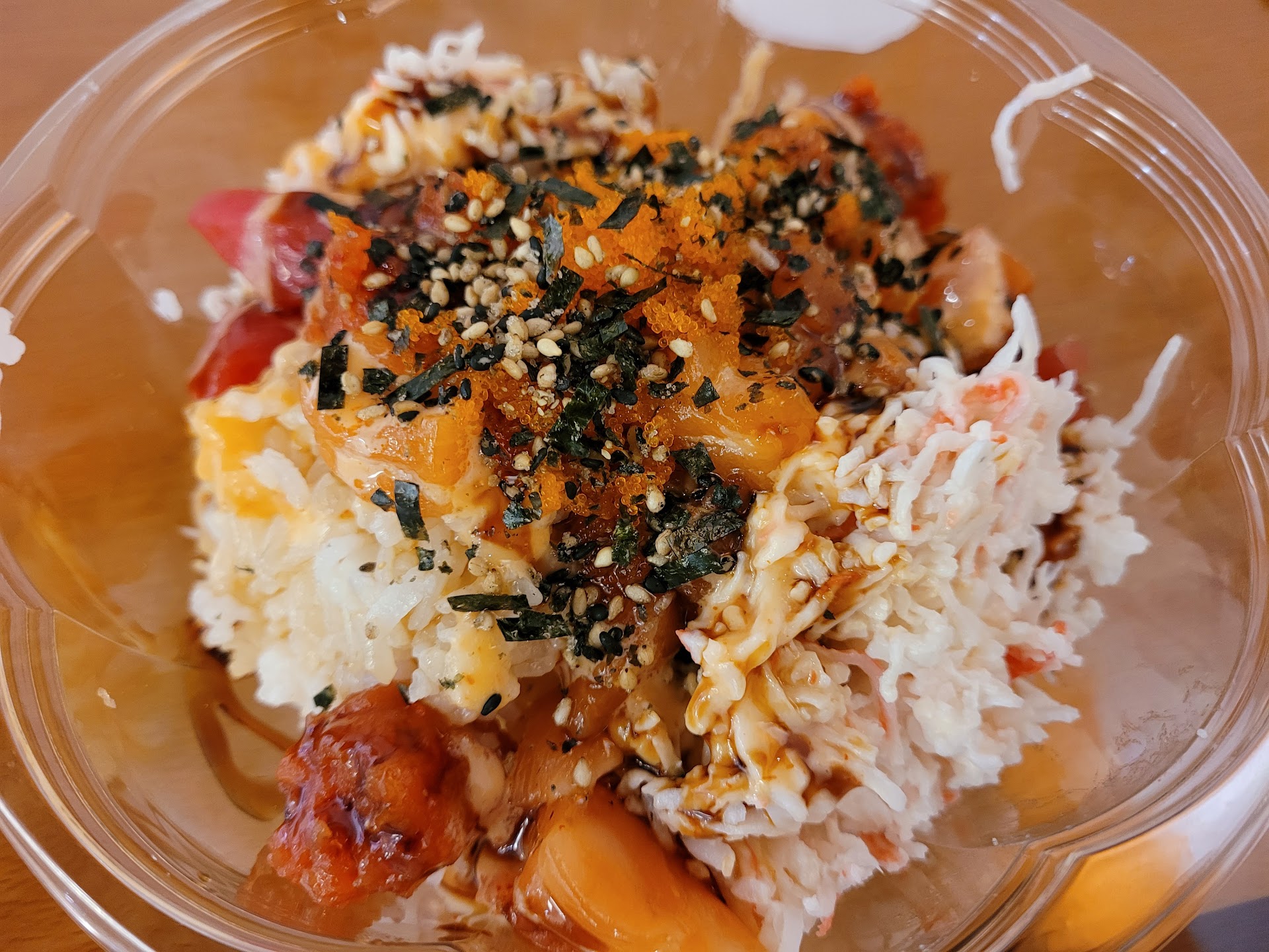 I ordered the 'Charlie's Bowl'. Seemed to be no dressing of any kind that helps meld the flavors of the various ingredients of the bowl together. Every tuna poke bowl always has at minimum the tuna/salmon tossed in a soy/sesame oil/rice vinegar type dressing and sometimes will have a touch of red chili spice to that dressing. Mixed in will often be masago and some green onion. This bowl was completely missing that. It was a ball of rice, with a small amount of greens (which had coarse iceberg lettuce in it - cheaper and lower quality) and on top was a lacking amount of fresh tuna and salmon, which were very small bits and not hearty quality chunks of fish that I would expect for a bowl that's $17 bucks and served in a takeout plastic dish.