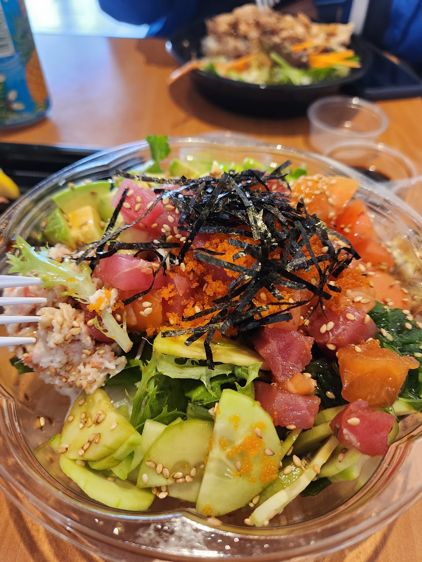 If your on the fence about Poke, I basically describe it as a Rainbow Roll in a bowl... You have a base (sushi or brown rice or a selection of salads), two or three proteins (chicken, tofu, shrimp, or various raw sushi-type fish chunks), then a bunch of toppings and sauces. It's just outstanding!!! Super clean, just the right amount, and it just never makes you feel gross unlike a lot of the fried foods you get elsewhere.