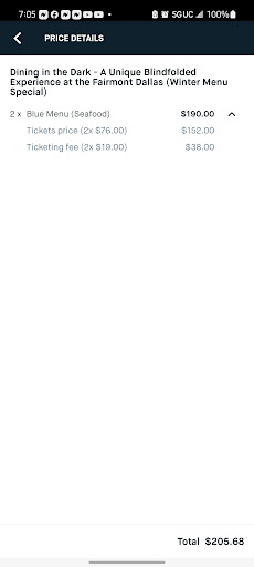 Read moreI bought tickets Dining in the Dark to surprise my husband with a different experience for his 60th birthday. I read views and thought this would a great surprise. I read the instructions before the date of the event. We got there early (20 mins as per instructions) and was told we wouldn't be seated until 5 mins before event was suppose to start ("6pm"). The event started at around 645pm. It seemed a little unorganized. We were seated and donned our blindfolds. We received the appetizer. Then came the 30 to 40 minute wait for our main course. It took so long my husband became in- patient and lift his blindfold (because we could hear the sounds of utensil on the plates). He saw everyone in our area eating except us. We both raised our hand (as per instructed if we need assistance). We both asked where our meal was. The staff member Said your plates are on the way. We received our main course about to 10 minutes later. The staff who served us said "be careful the plate is hot". NO IT WAS NOT!!! The meal was room temperature, at best Not hot nor warm. The meal was bland but tasty/edible (table had no salt or pepper on it). After the main course we were allowed to remove our blindfolds. We did a Q and A session with the Chef. Then we put our blindfolds back on for dessert. The dessert was not worth the wait. At this point we paid our tab and left. This experience was VERY LACK LUSTER!!! Our experience was NOT WORTH IT!!! My entire cost (ticket $76.00 x2, Ticket fee of $19.00 x2, the automatic food gratuity $10.00 x2, the 2 drinks we order $24.00 and the automatic 20 % gratuity on the check. Total over $250.00) You do the math. NOT WORTH IT!!! I am/We are VERY DISAPPOINTED!!! A WASTE OF a Beautiful...