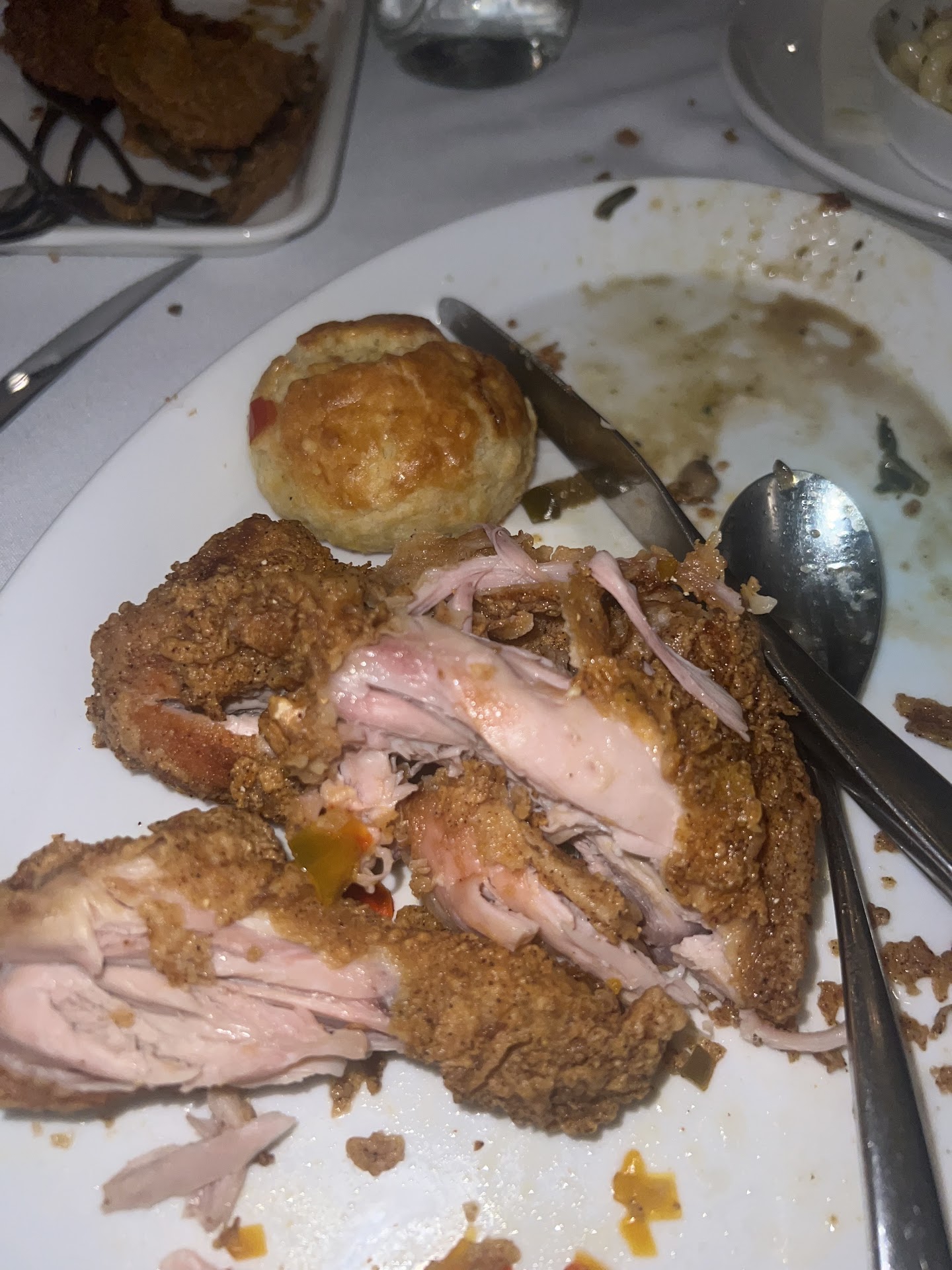 The mamaws chicken $27 for 3 prices of dark meat (crazy) was RAW!! I will include pictures at the end. With the chicken i got 2 sides peas and green beans. The peas and greens were unbearably salty we couldn’t eat more than 1 bite. Sent them back before our blood pressure skyrocketed. Meanwhile, the black tall woman who is a GM or manager of some sort is walking around the restaurant like everything is ok. Never comes over to check on us, only comes to take my raw chicken plate back to the kitchen. Doesn’t come back to check on us, apologize or make sure our experience was better. She constantly stared and rolled her eyes at our table, and was very dismissive during this whole experience.