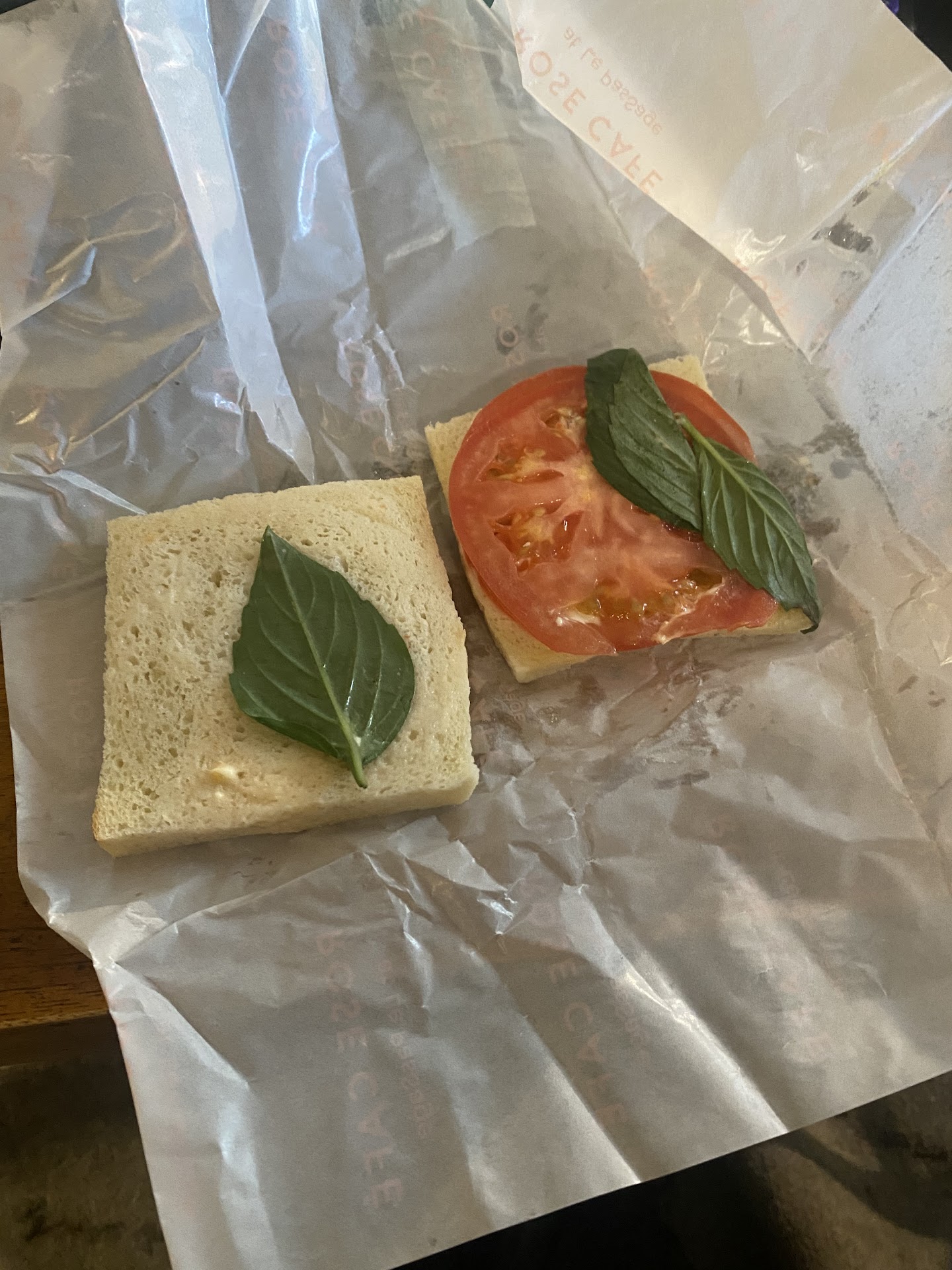 We went inside and ordered. I wanted the roasted chicken sandwich, they didn’t have it in stock. So I ordered the tomato basil sandwich. First, the sandwich is smaller than the size of my palm, I’m not exaggerating. It was on crustless plain white bread, and I’m not joking, had 1 thin slice of tomato and 3 basil leaves. That was the sandwich I paid (too much) money for.