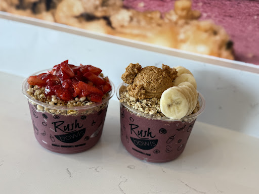 Read moreThis was our first time at Rush Bowls and we loved it! The bases are mixed fresh and don’t have the added sugar of the pre-mixed sorbet base (which I actually really love). My husband and I both got the Beach Bowl (his with strawberries and mine with banana). I subbed out my honey for peanut butter. The peanut butter was scooped on top of the bowl rather than drizzled! I had never seen that before and it was delicious! The banana was sliced fresh and the strawberries looked like they were packaged already sliced. Both were good! The bowls are a good size and we ate all of it. We wish the bowls were a little wider so we could fit more toppings on the bowl. We’ll definitely be back and are looking forward to trying something new! FYI - There’s only a small bar-type table on the wall across from the register with 3 stools inside. There are also 1-2 tables outside to enjoy...