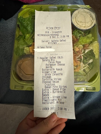 Read moreThe staff only gave you a pinch of topings as you requested throughout the line on both occasions i was here. Lady had very small hands and both times would use 2 or 3 fingers to grab the toppings. I had repeat wanting more on each topping as she never put anything in the bowl, literally 4 spliced pieces of black olives. Clearly she didnt want to have to refill a food item on the tray after 40-50 customers, i guess she fills them at start of the day and is too lazy to do it again. The process was dragged out because i had to tell her to go back each time and add more. She also didnt offer bread, nuts, orif i would like to purchase a drink (both times i visited). The toppings she was going scarce on are extremely cheap, but apprently not as cheap as her. Been to probably 10 different Salata locations, never had this issue, but happened here both times. Wont be back here again, save your $11, and go somewhere else or a different location, you only get half of what you pay for, half a plastic green box of food. Just shocked it happened twice, clearly not a mistake, greedy owner or management or...