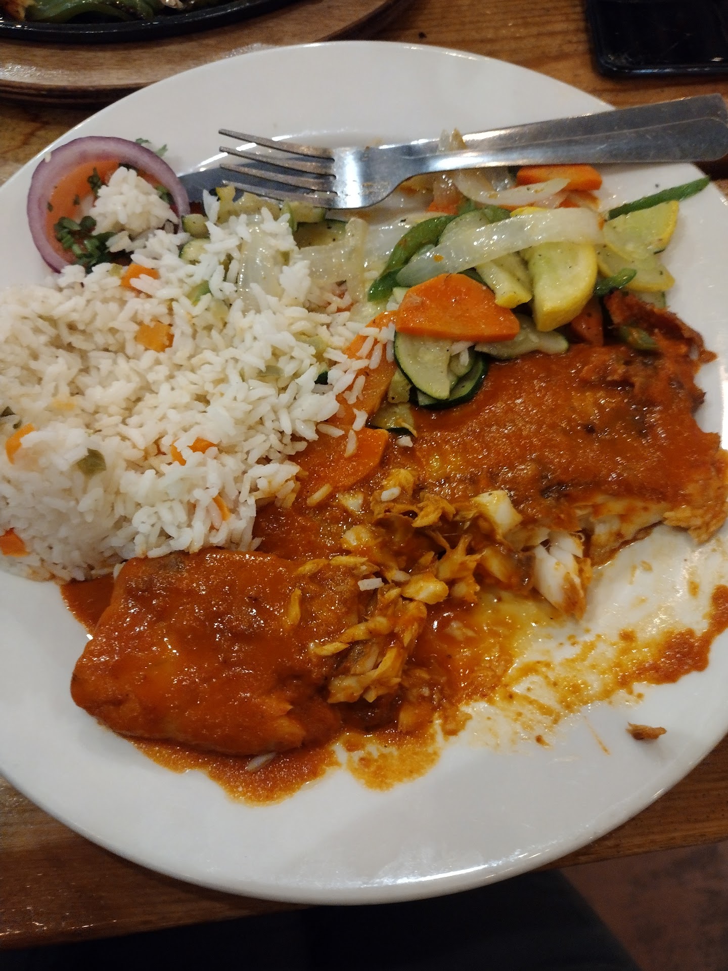 Read moreTried this place out for the last time! We ordered chips and salsa for a appetizer and the salsa was warm and pretty good. Not sure if it was the hair we found in the salsa that gave it a extra kick! As I took a chip and dipped it in the salsa up came a hair hanging from the chip along with salsa. I notified the waitress and she asked for assurance if the hair actually came from the bowl of salsa so my husband and I reassured her that it most definitely came from the bowl of salsa she served us. She took the salsa and brought us a new batch. Then my husband ordered the chicken, steak and shrimp platter and it smelled pretty good when we received it. Unfortunately it didn't taste as good as it looked. The shrimp had a burned taste and the steak tasted like oil and fat. The steak was also dry and over cooked. I ordered the grilled tilapia which I didn't get a picture of but it was tilapia without any seasoning and it just looked very untasteful so I asked if I could replace the dish with something else because none of the other ways they made the tilapia interested me and the waitress said she would have to charge me for that dish since it was already served so I told her I'd just keep it and to just make it as the tilapia al Diablo and the sauce was not good. It was a bit spicy and sweet it just had a really weird taste to it anyway The tilapia al Diablo which is just a spicy sauce over unseasoned and unflavored tilapia wasn't a good choice either. The customer service sucked. We spoke to the manager on duty and she was no help. Another thing we sat outside and when entering to use the bathroom all the waitresses were hanging out in front of the only door to enter and seen me approaching and went back to gossiping and didn't move from in front of the door it was just a weird experience and weird atmosphere not to mention very unprofessional except for the host he was very cheerful and had good energy when we arrived and left. Save your money and spend it at a better seafood place because this place is a...