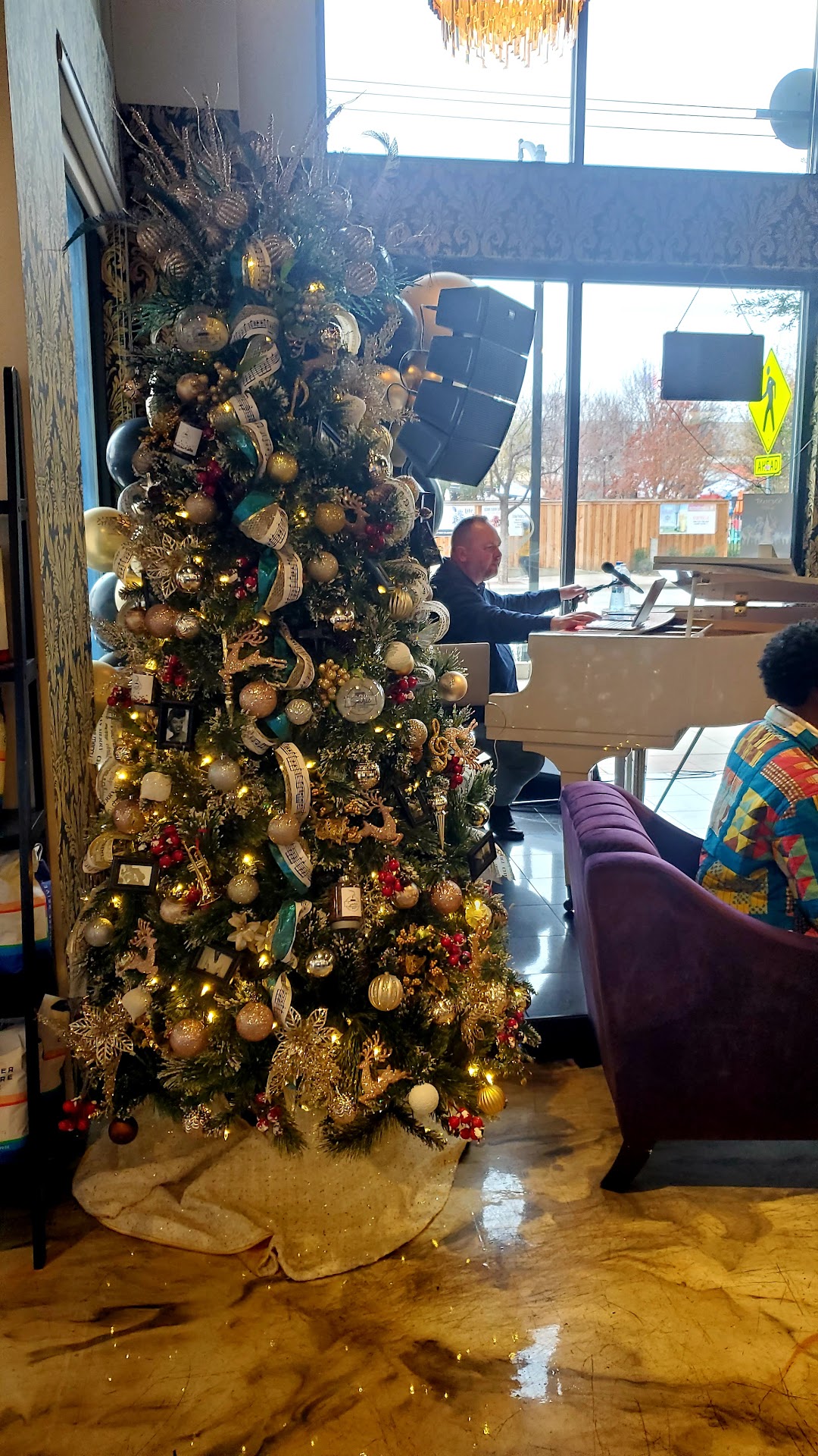 I checked this place out on here before telling my bestie that we should meet up there for brunch today - Saturday. Not everyone has brunch on Saturday, and when I saw Jazz mentioned on their website, I had to check it out. One problem, though - they didn't answer the phone when I called to see if I needed to make a reservation. My friend said, let's just head that way, it's halfway between us. So lucky that they weren't too busy when I arrived. I parked in the parking garage behind it and walked around to the front. They have a nice patio facing Singleton equipped with heaters! When I entered I found a clean and sleek coffee bar. Simple but nice black tables with black chairs, bright whitish walls & one dark green wall, lots of windows so it's nice & bright, jazz accents here and there. Straight ahead was a comfy sofa, above it a mural of jazz musicians painted on the wall. Next to that was small bar, connected by counter to the yummy sweets display, connected to the counter to place your order, then continued to the coffee bar. The man behind the coffee bar was a mix-master! Made my spiked latte soooo delish! Right inside the doorway was a beautiful white grand piano! The entertainer has a beautiful voice and even had the crowd sing along with him! Next to him was an awesome Christmas tree with some unique decorations. Not sure if you can make them out in my picture... Now to the service - how refreshing it is to actually be spoken to when at the counter! A smiling woman greeted me and we spoke about the restaurant and the menu and even the spiked latte I ordered. I felt so very welcome. You order at the counter & they give you a number and someone brings it out to you & takes away your dirty dishes, so when you are paying (at the time you place your order) don't forget to tip. As I went to a table to get settled, a couple asked me to take some pictures of them in front of the tree & then on a couch in front of a cool painting on the wall. Everyone was so friendly - well, it's a neighborhood cafe, not a chain who wants to get you in and out. The food - OMGee, the food was so good!! So I already knew what they were having because someone on here noted that they change the menu each week, so I went to their website to see what was on. My buddy & I both chose the 'Deck the Halls Waffle Plate' with scrambled eggs, fruit, waffles & sausage or bacon. It came with a small bowl of grits. Neither of us cared for them - they had a sort of lemony flavor to them. It was all very good and fresh. At $23 I thought it pretty steep, but factor in the great service and the live music - I feel it's a good deal. I look forward to returning - check their website, they have...