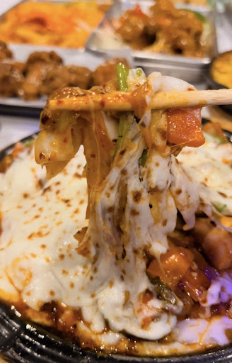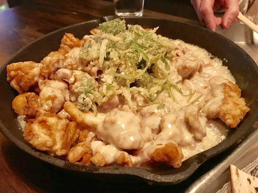 The ambience is stellar and location is also great. I love when a place is easy to find so that's a plus right off the bat! This fusion Korean bar is so pretty on the inside it'll blow your socks off. The vibe is very modern and the lighting is so pretty. There is an open area with tables and seating along with a handful of enclosed areas that you can sit in also if you like a little bit of privacy. They also have karaoke rooms so you don't even have to leave the place if you want to get your sing on!! Ok ok so let's get to the juicy stuff. Their food is really interesting and is a mix between gastropub and Korean traditional bar food!! What does this mean?? It means you get a mixture of bold flavors and a lot of new ideas that will explode in your mouth!!! I'll give you a list of a few things we ordered and you won't go wrong getting these things off their menu! First we ordered their ddukbokki which is ricecakes (basically Korean mochi) stewed off in this amazing sweet/spicy red pepper sauce. The dduk (rice cake) are in HUGE chunks and they are super fun to bite into and eat. Then we ordered gimmari to go with the sauce from the ddukbokki. These are basically clear noodles rolled in nori, then coated with tempura batter and deep fried!!! Take one of these and dip it in the red sauce and there is really no better heaven! We couldn't possibly stop there so we went ahead and ordered their mussel soup, 101 fries, and cheese dduk kalbi. The mussel soup has a kick to it so you had better tighten your trousers and get ready to get a nice spicy broth in you! The 101 fries were one of my favorite trendy items. They are thin slices of SPAM (yes SPAM!!) covered in panko crumbs and fried up like french fries!! These were absolutely amazing. If you like SPAM or if you just like to try new things OR if you want to try SPAM but you have always been scared to for whatever reason .. then this is a must!!! Alright, I'll stop raving about the 101 fries. Moving onto the last dish. What on earth is cheese dduk kalbi?! Well that's a good question and that is precisely why I went ahead and ordered this dish, too. It is ground beef made into a perfect large meatball sized ball with cheese INSIDE of it. Then it is cooked to a perfect medium and placed in an iron skillet that also has a beautiful bedding of cheese (fondu style) to sit in. The outcome is this : the skillet comes to you nice and hot .. you cut into one of the meat "balls" that has been placed in the amazing cheese sauce, and then gush ~ you get cheese oozing out of the meat to meet MORE cheese that is sitting in the skillet ........ Must I say more?? Just get it!!