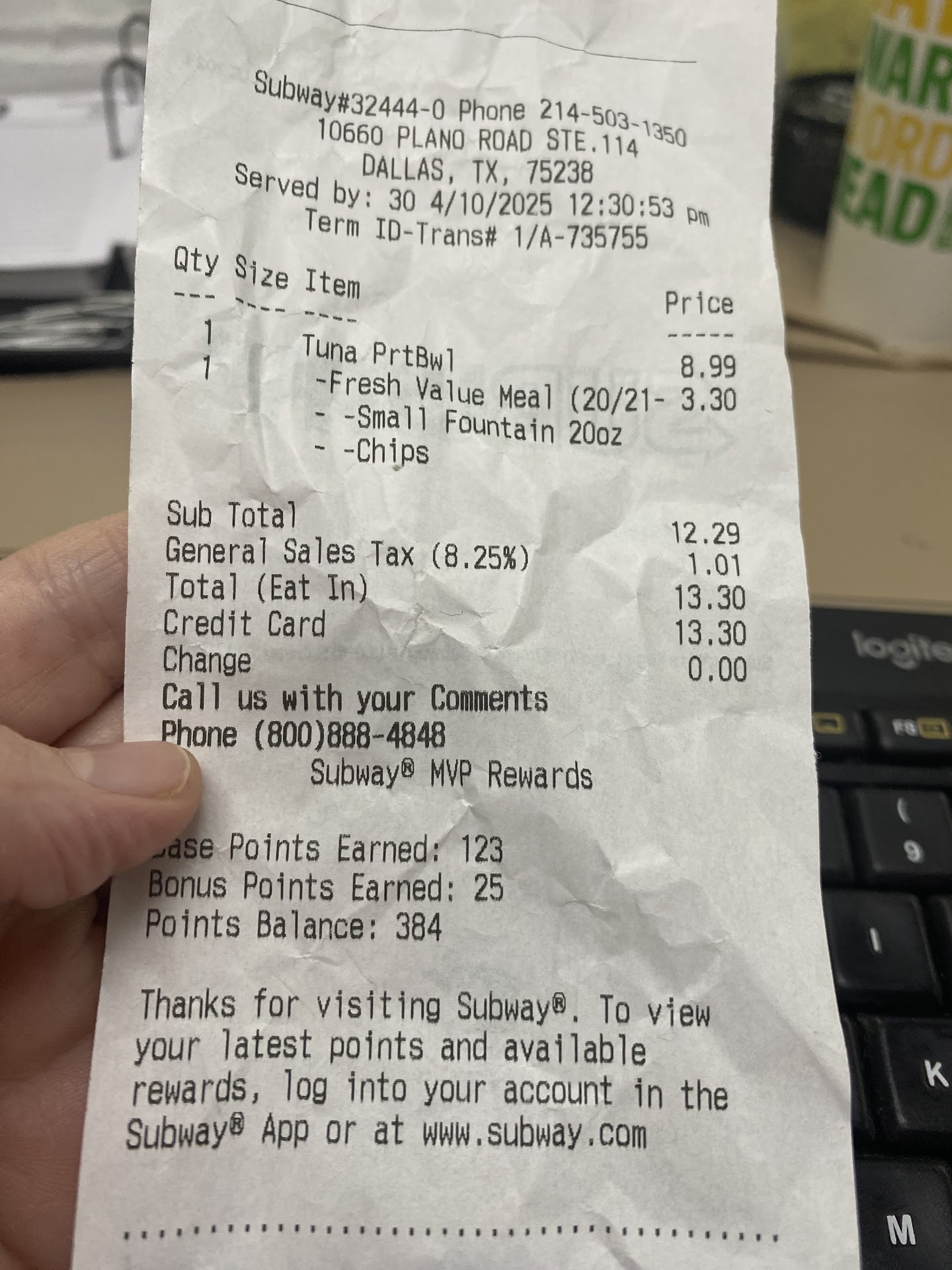 Read moreHATE THIS PLACE. So I got to work here for a whole day! The owner made me pull the hot tray out of the toaster with just my hand. Over and over. When I would stop he would yell at me to do it. I went home with burned fingers. There is also a portion size chart on the cutting board. He is seriously so cheap he crossed everything out with sharpie and halved the portions. Take my word for it and DO NOT GO HERE. The guy is a total slave driver and he does not even know what he is talking about. The working conditions were bad enough that I could not pay my rent and still did not go back the next day. Trust me, the last thing you want to do is line this dudes pockets. Go to the subway on Audelia and Skillman. They actually give you the...
