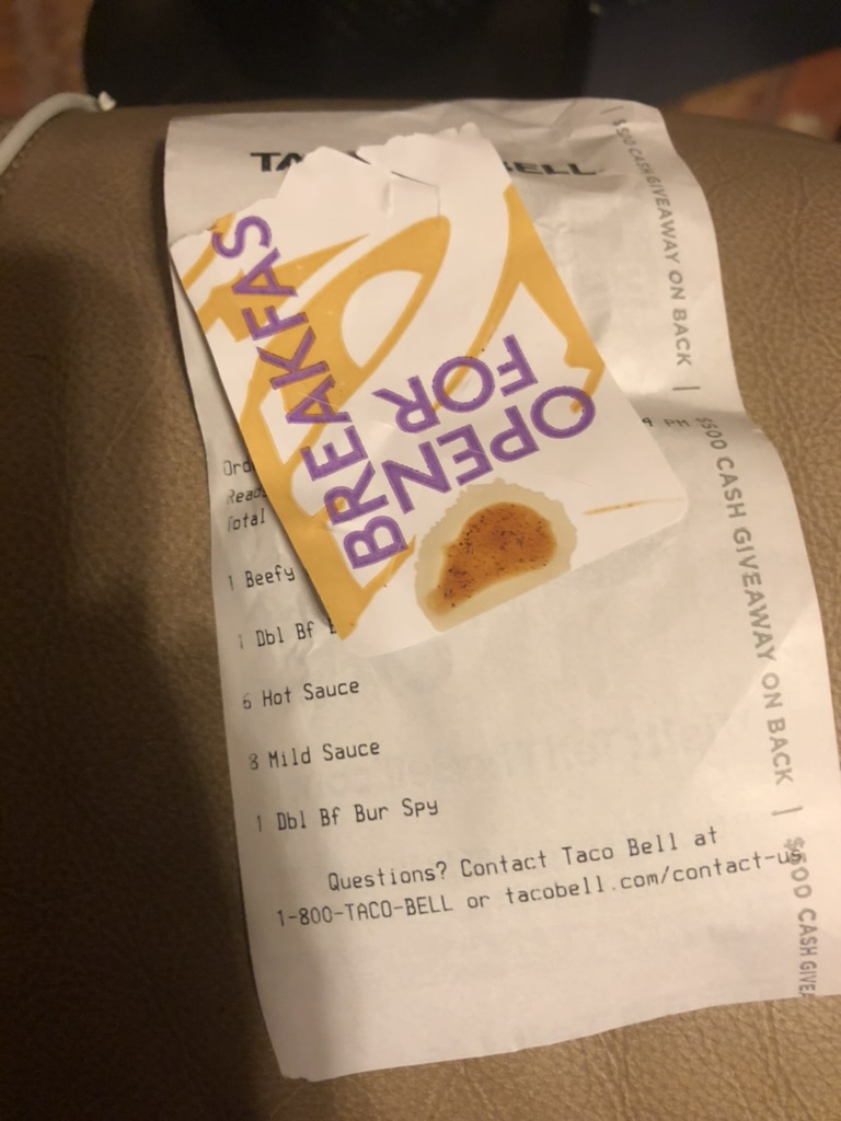 I am all for app ordering because I can sometimes be very specific on how I want my food and app ordering relieves me of the embarrassing repeating because its not entered correctly. However, when I app order, I truly expect it to be accurate because I have done the work of entering what I want. So I get to the window and they give me a bag. I ask, "is there sauce?" He says yes. I open the bag and there is no sauce. I look back at him and say, "there is no sauce in here." He says "oh, what sauce do you want?" I pointedly look at the receipt for the order details that were entered at time of ordering and say "6 Hot and 8 Mild sauces". He sticks his hand in the container and drops some sauces. I get home and open my back, NO HOT and NO MILD. ALL FIRE AND DIABLO. This is ridiculous! Then when i tried to tell Taco Bell instead of Google the ticket does not contain a store number. All these negative reviews on this is location, you would think someone would do...