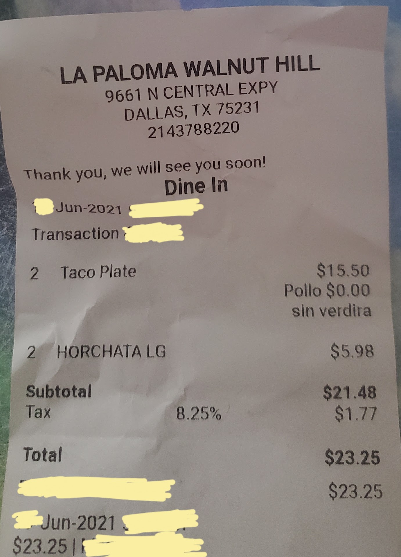 Read moreNever again đ NUNCA MĂS I used to eat at La Paloma at Coit years ago, I visited this location once few months ago and never comeback, now I remember why⊠Overpriced and ridiculous portion size. Flavor is not good anymore It doesnât taste like real Mexican food. You con actually see it, there is no effort making food here. I got torta de milanesa last time. The bread itâs huge, but the meat , avocado and the rest inside are just ridiculously little. Almost nothing. WTH?!?! This is not the first time, come on!! See the pictures by yourself As I said: Never again. If you are looking for good and affordable Mexican food, this is not the place. Donât Waist your money here.