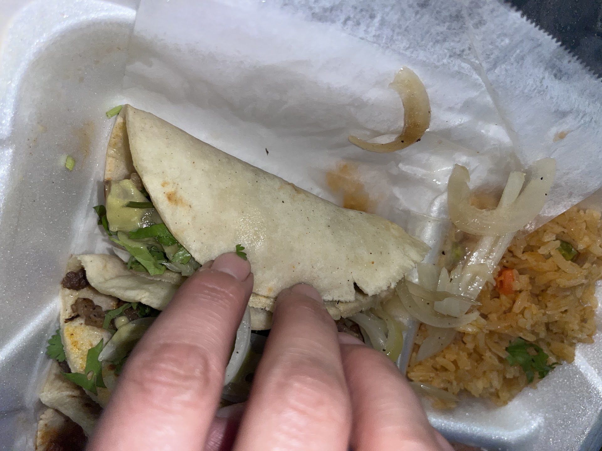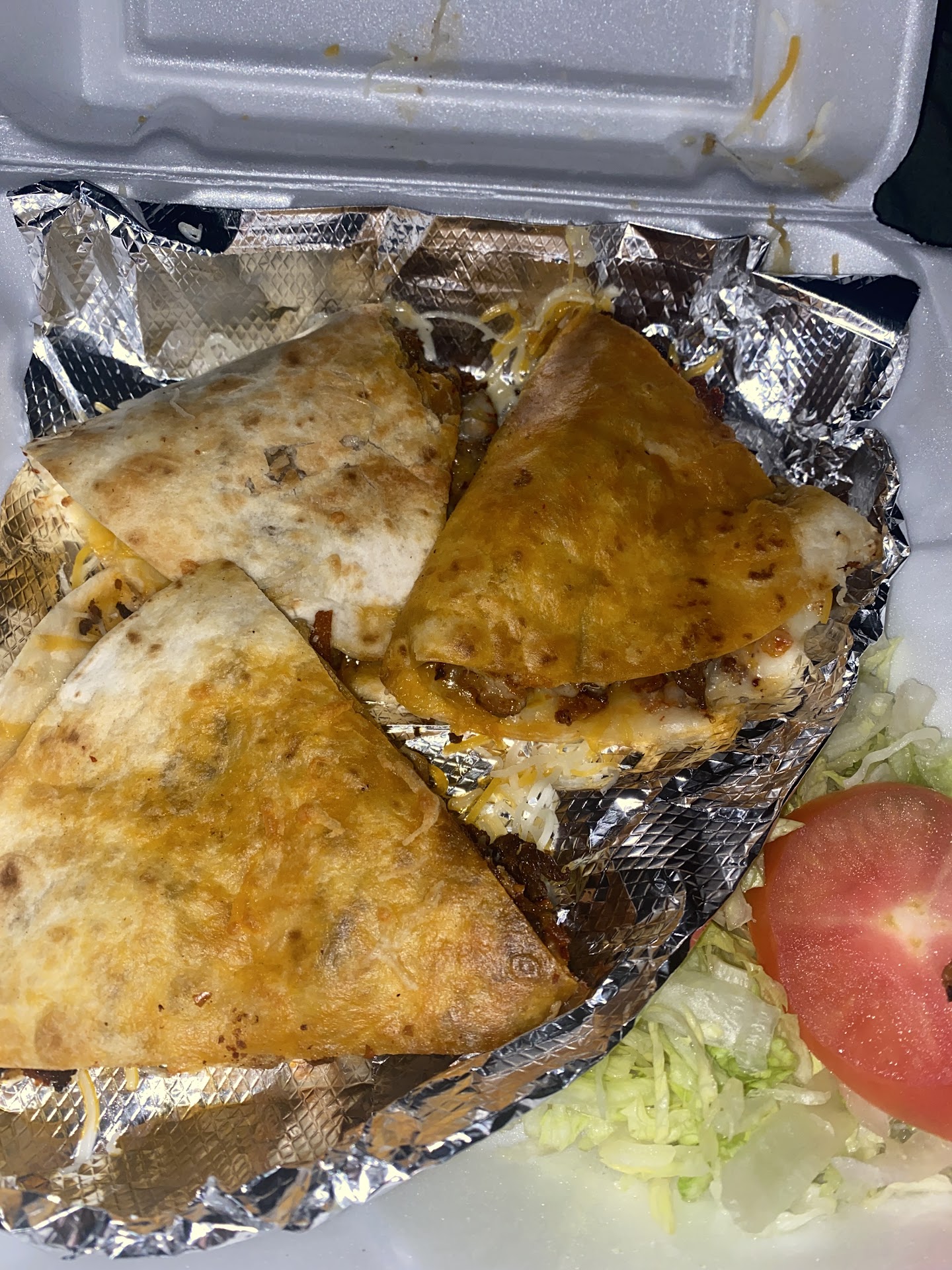 Not only did we not get all of our order, the food was awful and greasy, yet somehow still very very dry. Honestly was disgusted just by the appearance of the grease alone. I was hopeful maybe it would at least taste good but everything from the tacos, (which also we didn’t get all of but paid for), the rice, and the quesadilla was disgusting. They also gave me a SLICE of a tomato to chop up myself for my meal and a pile of lettuce 😂 one small slice of tomato on a huge pile of wet lettuce. I had...