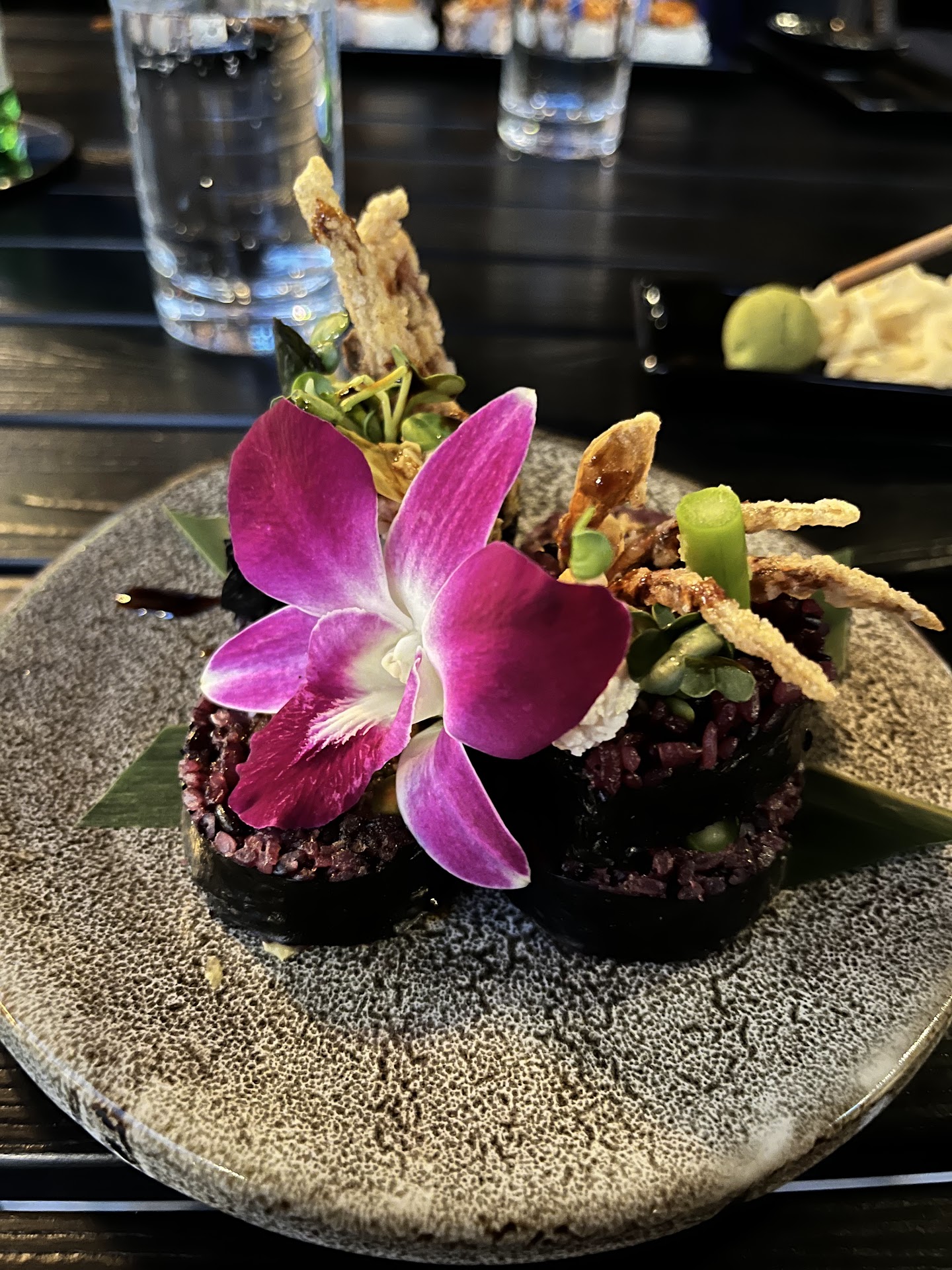 The drinks were so good. We had the lychee mocktail and the tequila mockingbird. Very pretty and tasty drinks. We had the chicken gyoza they were so pretty. The dipping sauce was at the bottom of the bowl and no it didn’t mess them up. The presentation was phenomenal on all the food. The house miso soup was very good as well. The rice in it kind of fills you up quick so be careful. Our sushi was the black widow and the lion king.