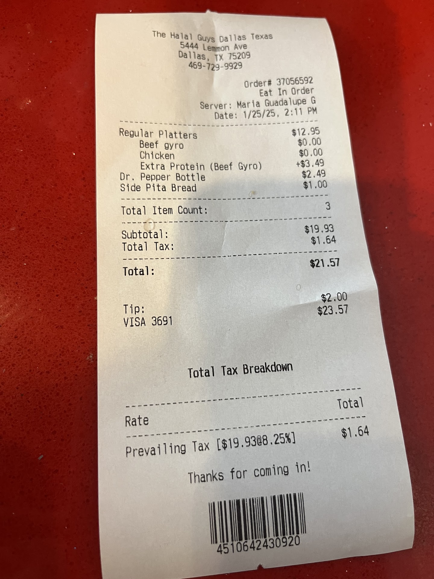 Ā Ā Ā Read moreWent here at 10pm tonight and waited for 5 minutes and was the only person in the front. The only employee I saw was washing dishes in the back. I ended up going to Whataburger next door instead. This isn't the first time I've had to resort to Whataburger. One time Halal Guys was out of beef.