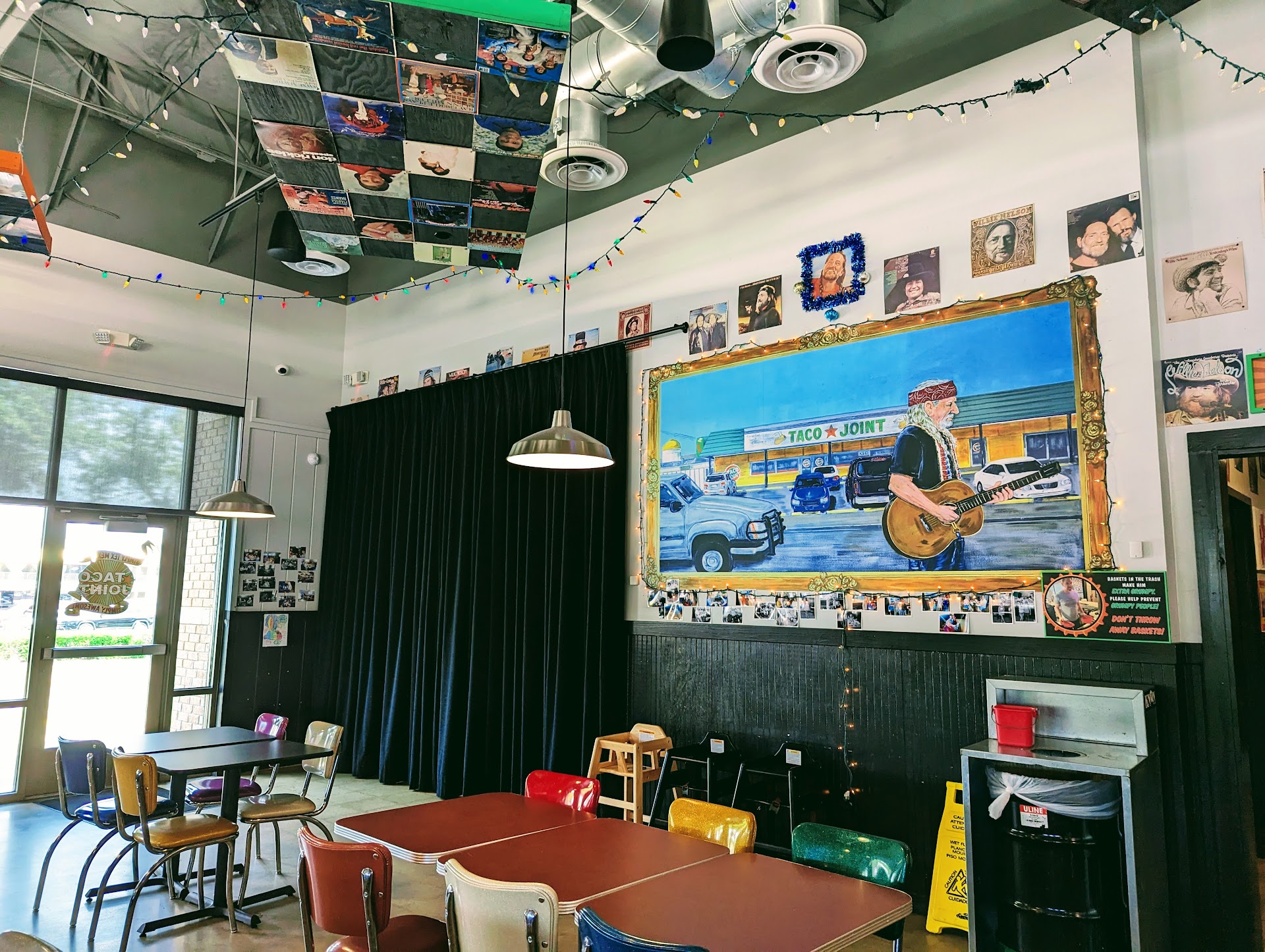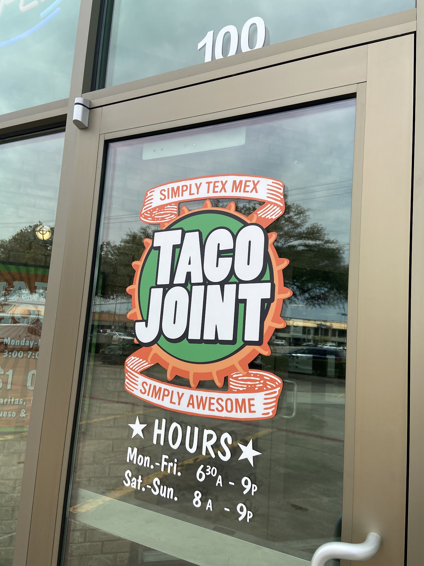 Read moreI’ve lived in this location almost 22 years. When Taco Joint opened right next to my apartment I ignored it, I figured it was just another TexMex option, and discounted it. HOW DUMB! My daughter visited from NJ and we decided to walk over and try it out. YUM! It was delish!!! We had burritos- hers with shrimp, she is vegetarian, and mine with ground beef. They were STUFFED! HUGE!! We had chips and queso and margs. The queso was served warm and was soooo good - I bought some to take home with me! The margaritas were generous- NO skimping on the pour. WOW! You order when you first enter, go to a table ( large room - good for families as well) and a server will deliver to your table. Very good service when we were there, and also a very attentive manager. He gave us a card which I think comps us a special item on a (DEFINITE) future visit. We WILL be at Taco...
