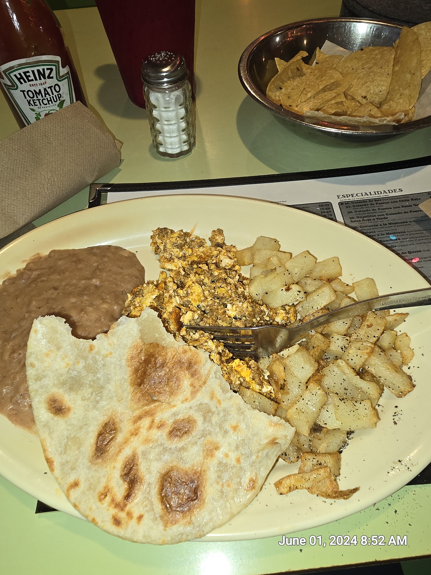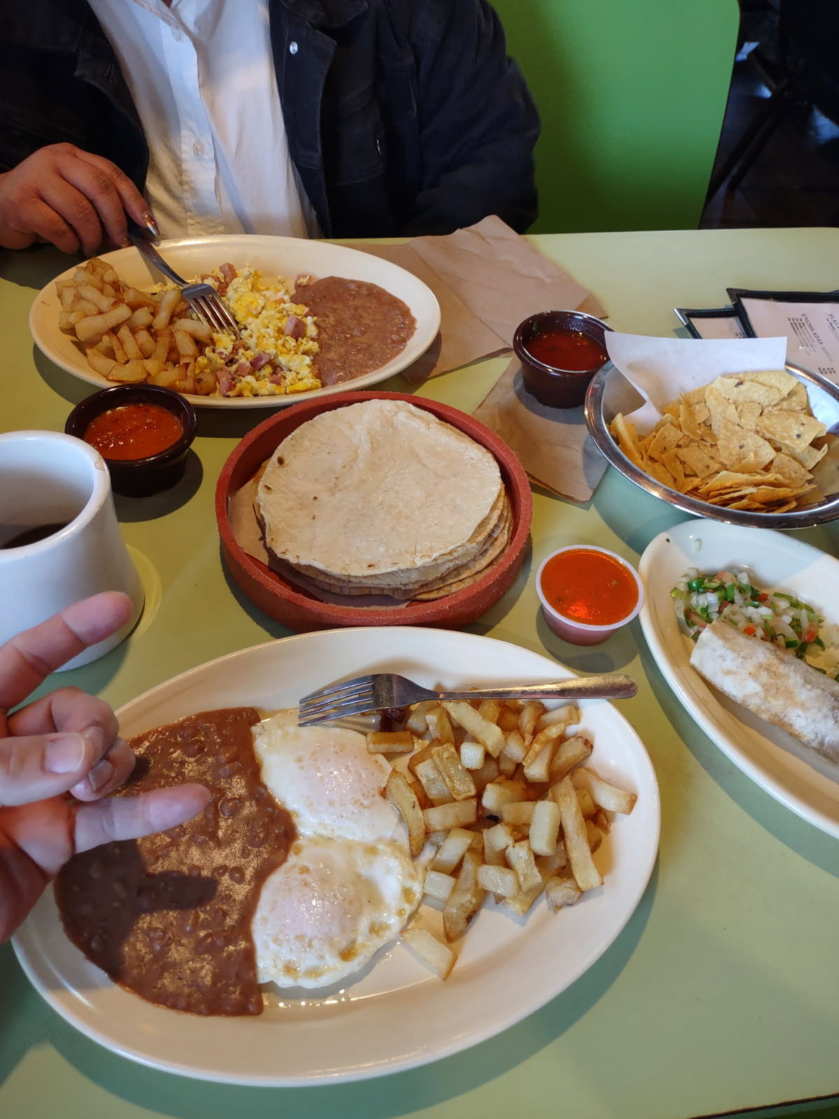 The burrito came out without any eggs in it. (What?!) The tortilla was super dry, crispy, and with burned black circles in many places. The bacon and sausage were also dry inside and the cheese was only partially melted. Felt like I was eating out of a bag of Kraft shredded cheese. I want soft, large burritos that I can barely close my hand around, with eggs and melted cheese inside. She was rushed, distracted, and cook blew it by giving me a burned, crispy tortilla.